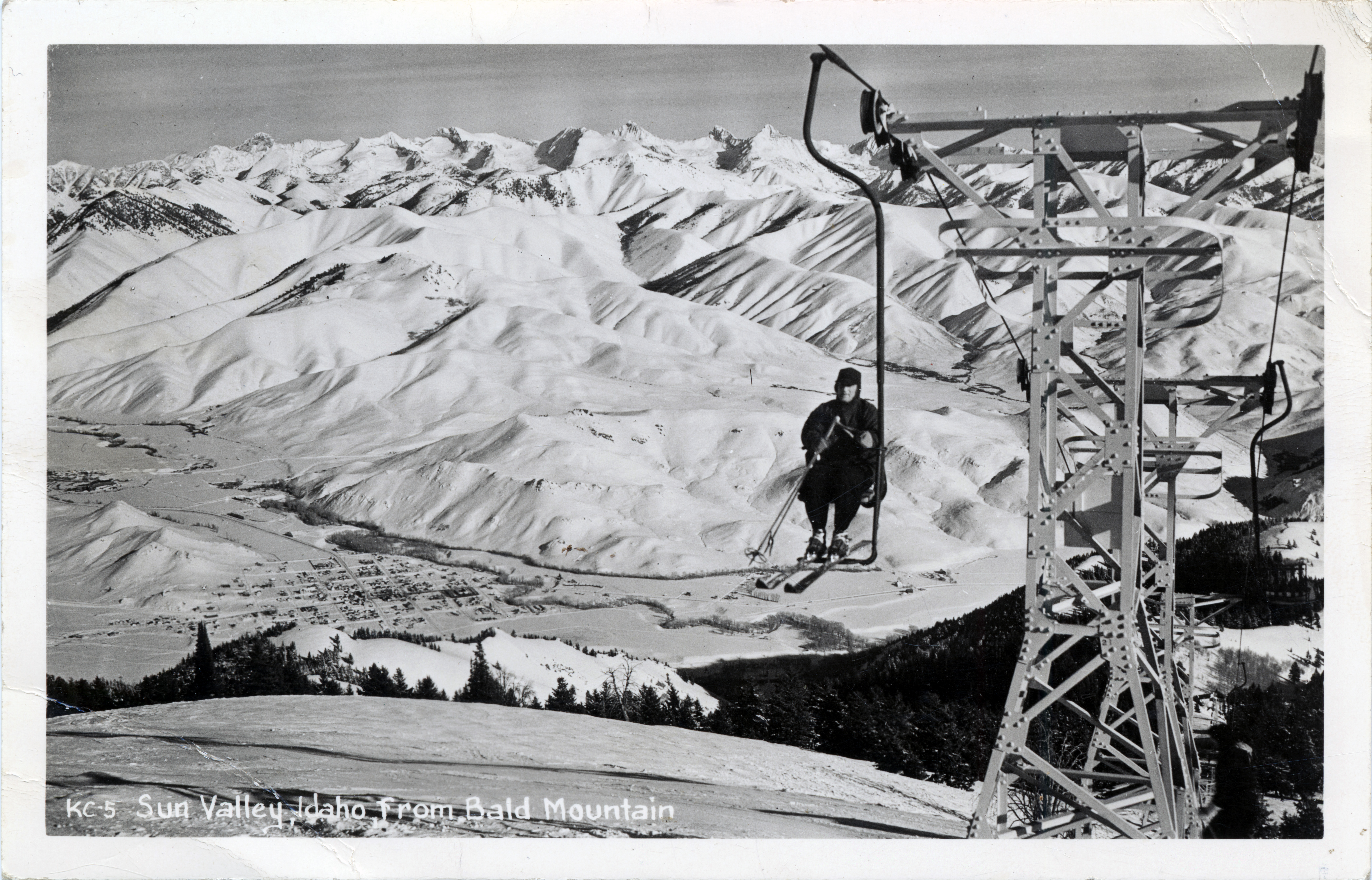 - A postcard with an image of a person riding a ski lift on the front side. Printed on the bottom of the picture is: "KC-5 Sun Valley, Idaho, from Bald Mountain." The back side of the postcard is blank.