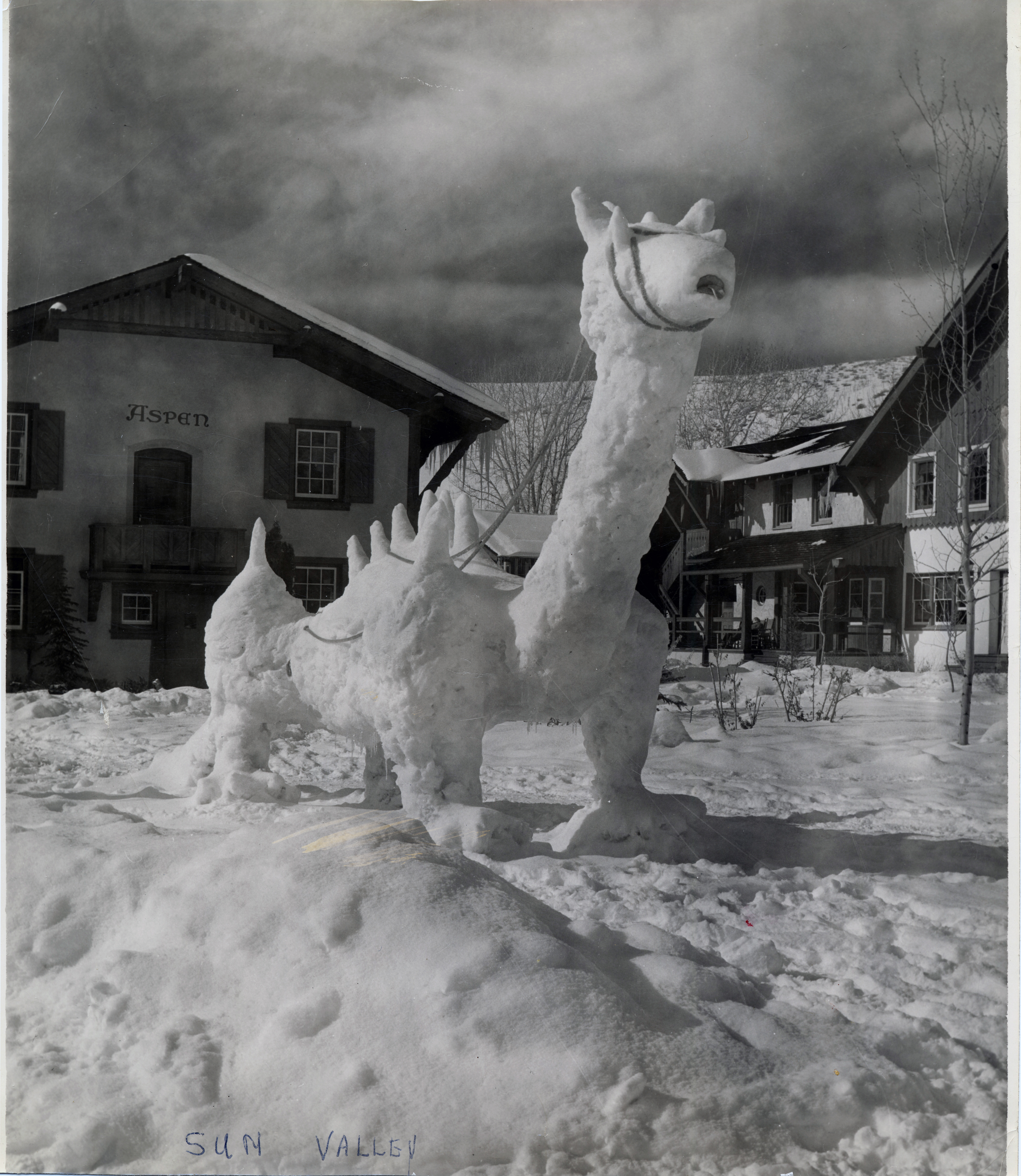 - A large creature made of snow is in front of a building with the word "Aspen" on it. "Sun Valley" is written on the front of the photograph.