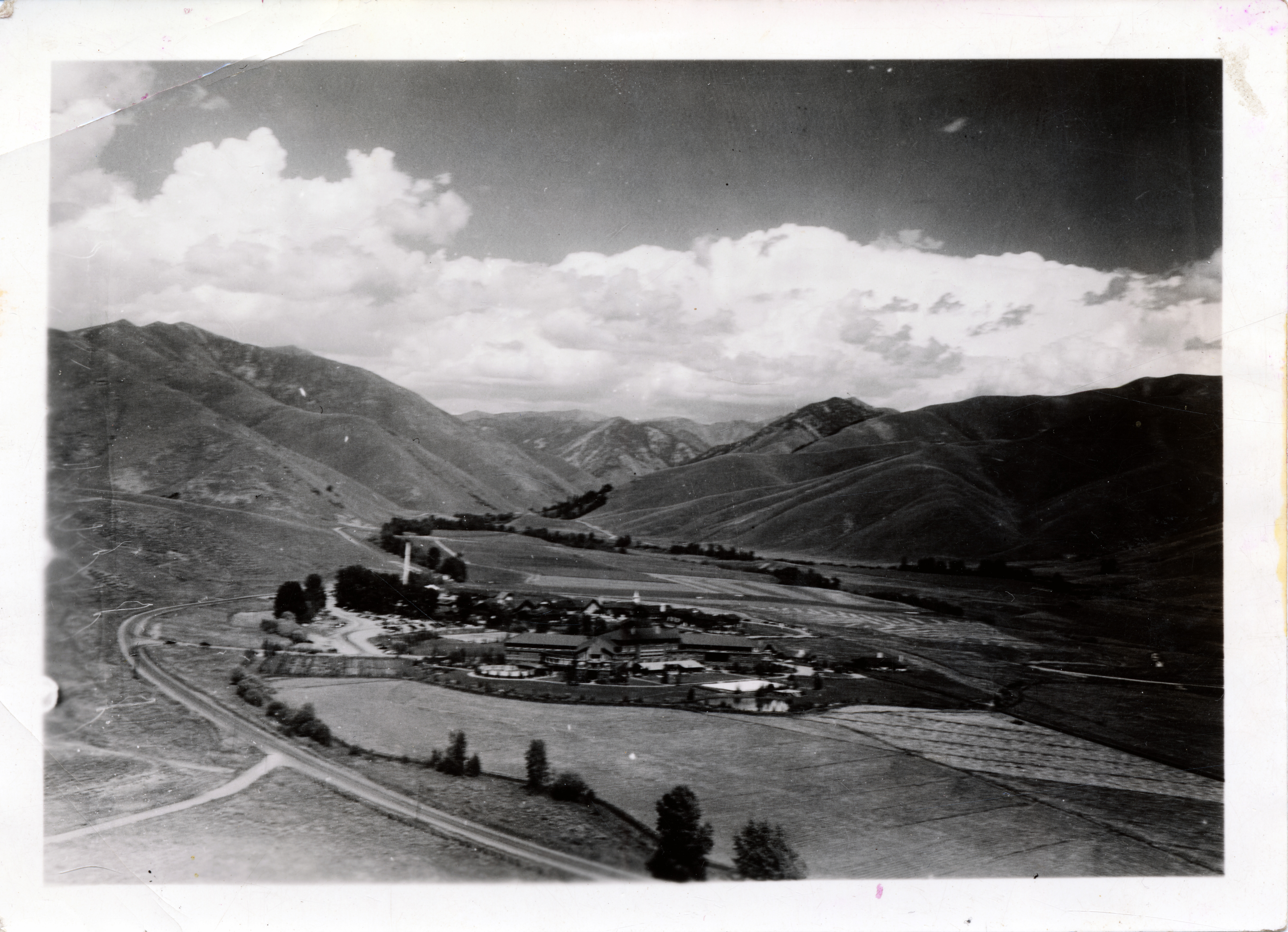 - A view from above of the resort at the base of mountains."Sun Valley from Penny Mt., Thayer." is written on the back. The back of the photo is stamped with "Jul 21 1941."