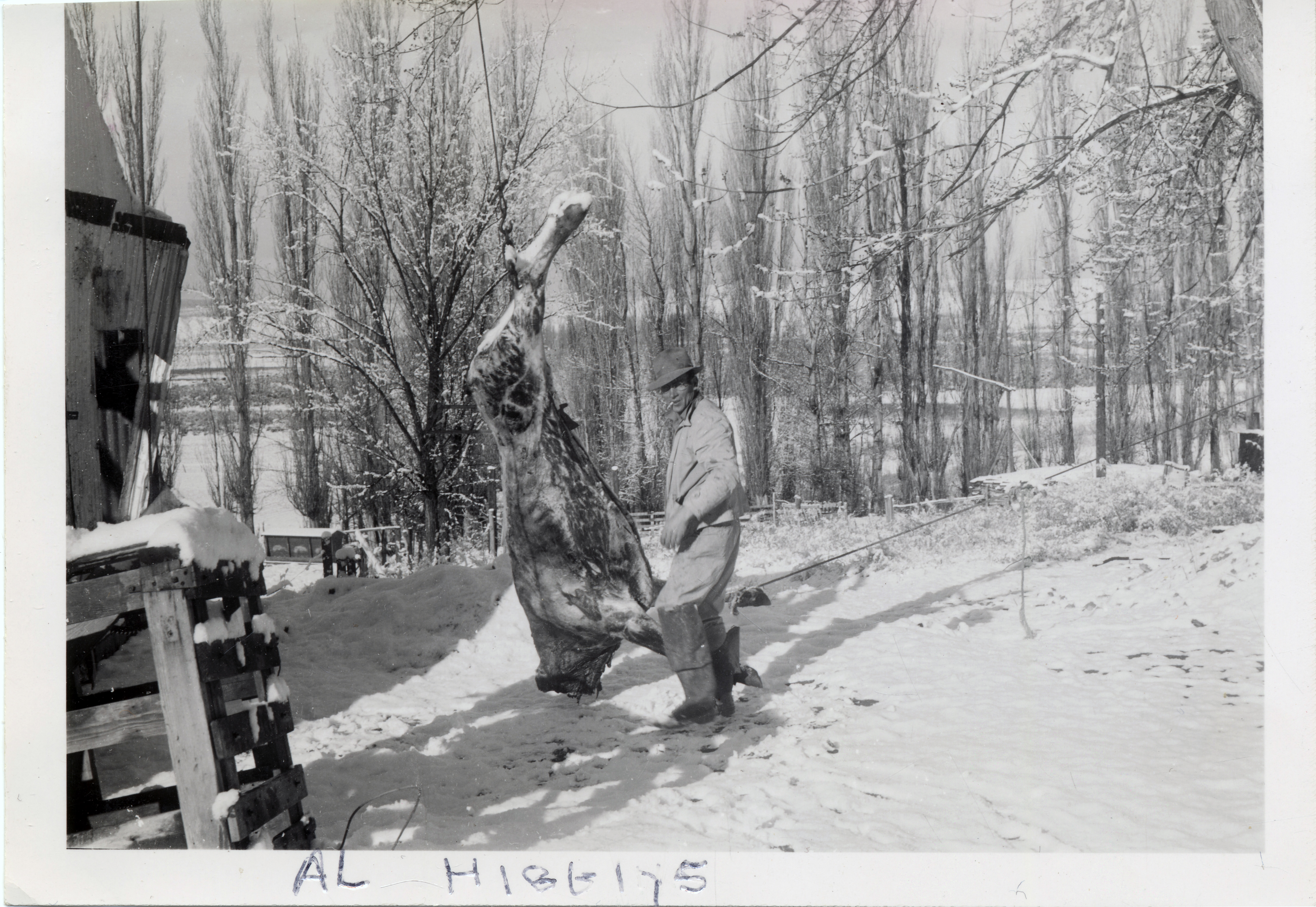 - A man stands and smokes a cigarette next to a headless animal carcass, which is hung upside down by a hook."Al Higgins" is written on both the front and the back of the photograph. The back of the photograph is stamped with '874 [illegible]'