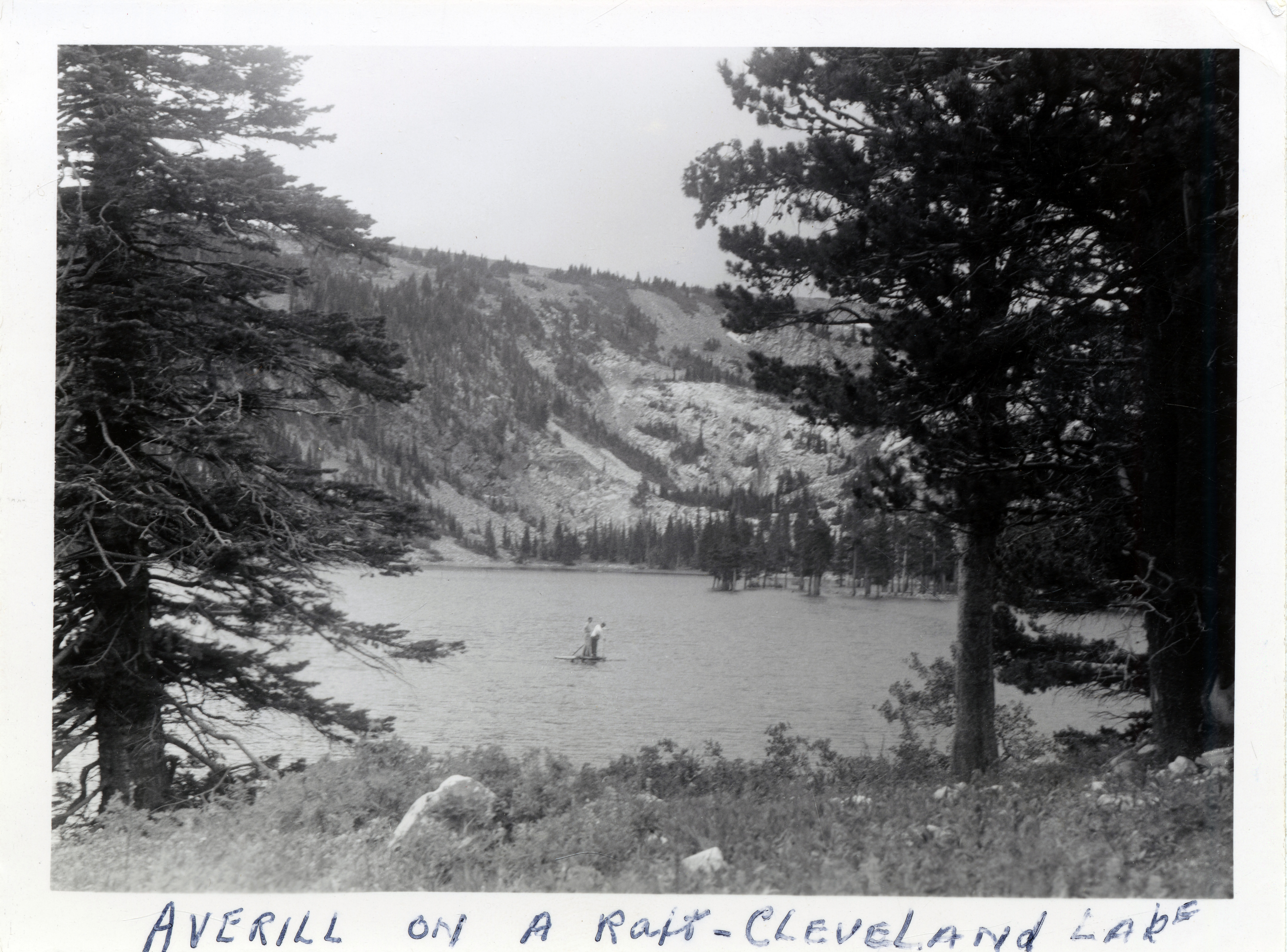- Two people paddle a raft on a lake. A section of a mountain is visible in the background. "Averill on a raft- Cleveland Lake" is written on the front of the photo. The number 217 is stamped on the back of the photograph.