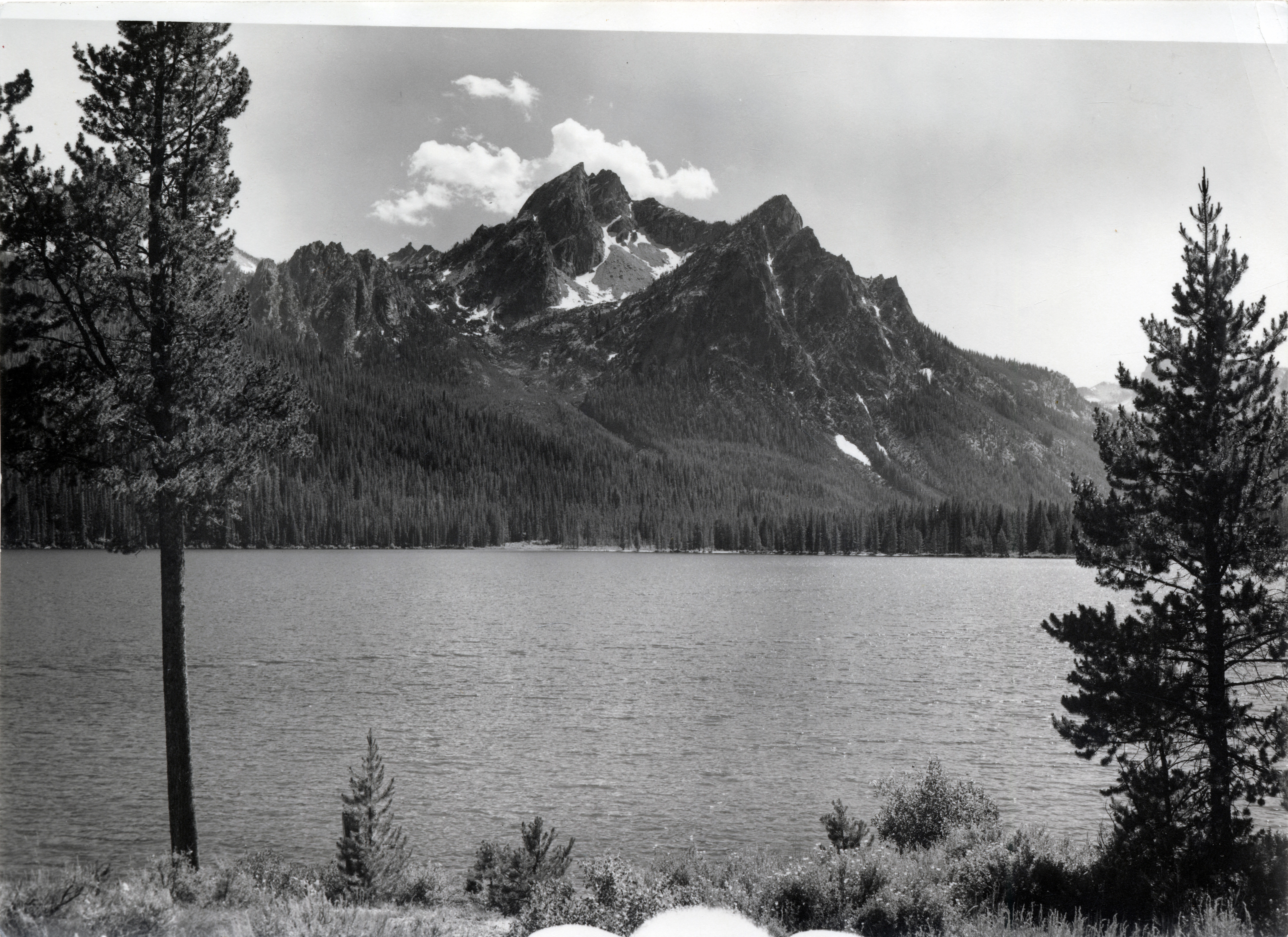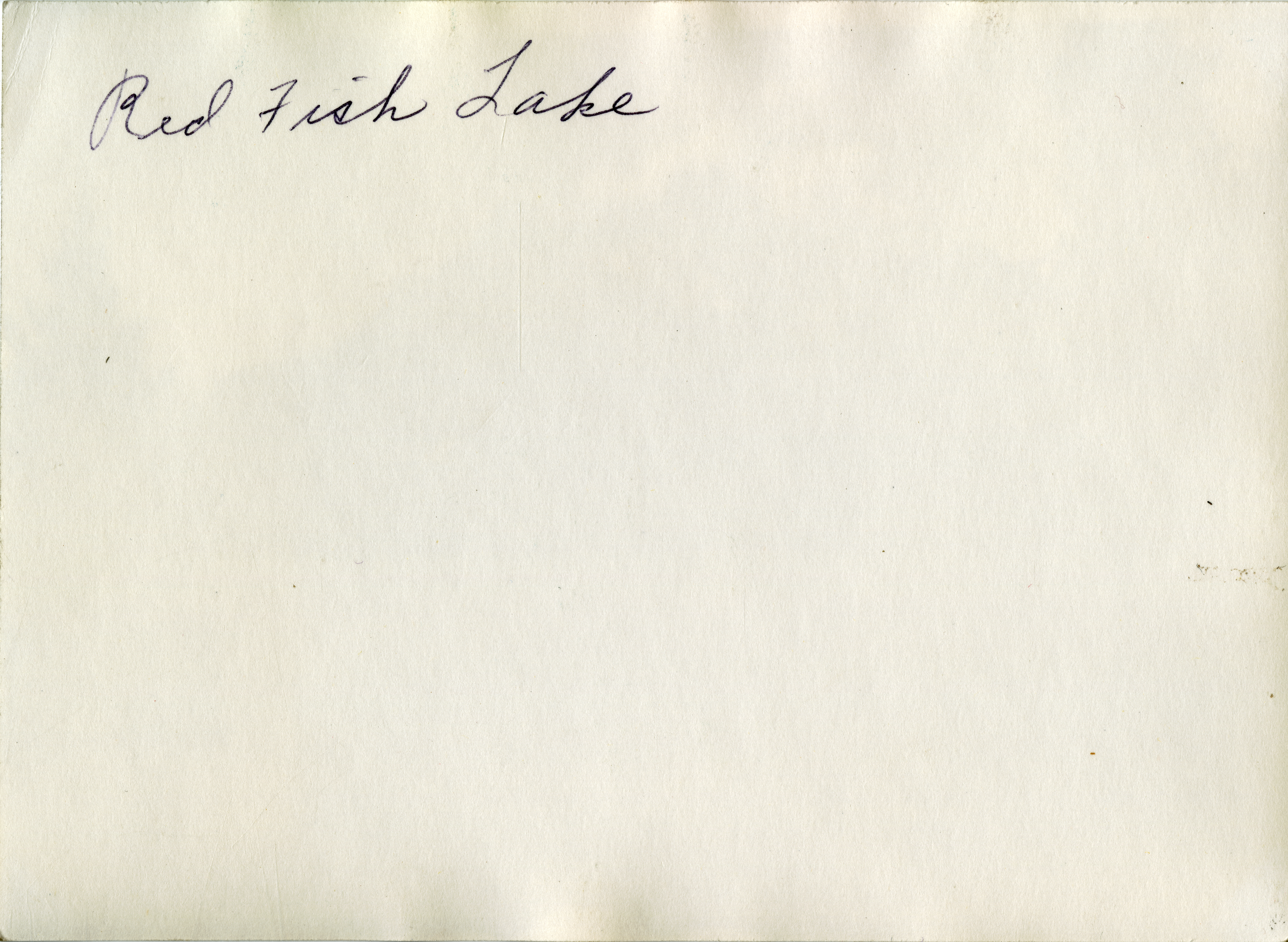 - A view of a mountain peak above a lake. "Red Fish Lake" is written on the back of the photograph.