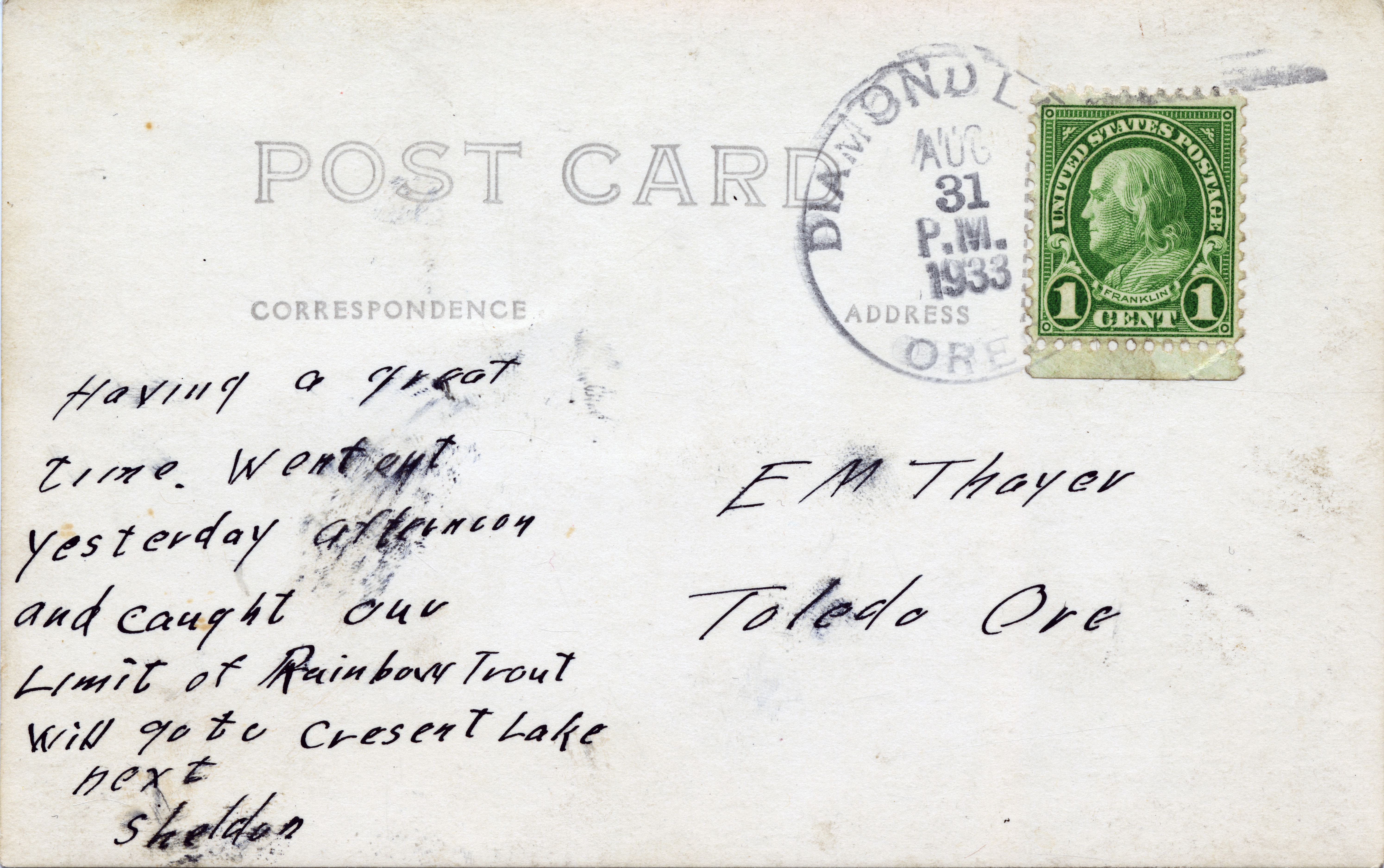 - A postcard featuring a photo of a building and trees covered in snow. "Diamond Lake Lodge in winter. 465." is printed on the image. The back of the postcard is addressed to EM Thayer in Toledo, Oregon and reads, "Having a great time. Went out yesterday afternoon and caught our limit of Rainbow Trout will go to Crescent Lake next, Sheldon."
