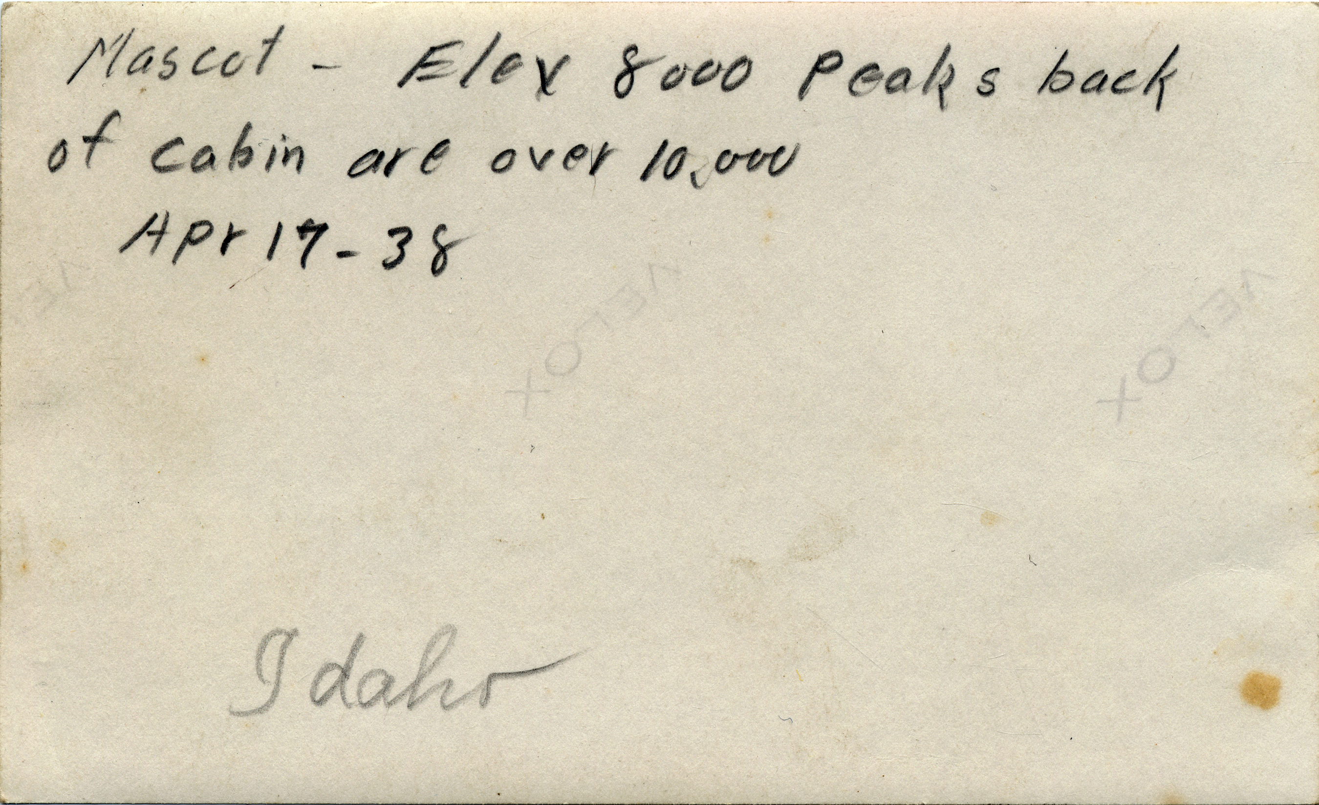 - A log building at the base of a mountain, surrounded with snow. On the back of the photograph is written: "Mascot - Elev 8000 peaks back of cabin are over 10,000 Apr 17-38, Idaho."
