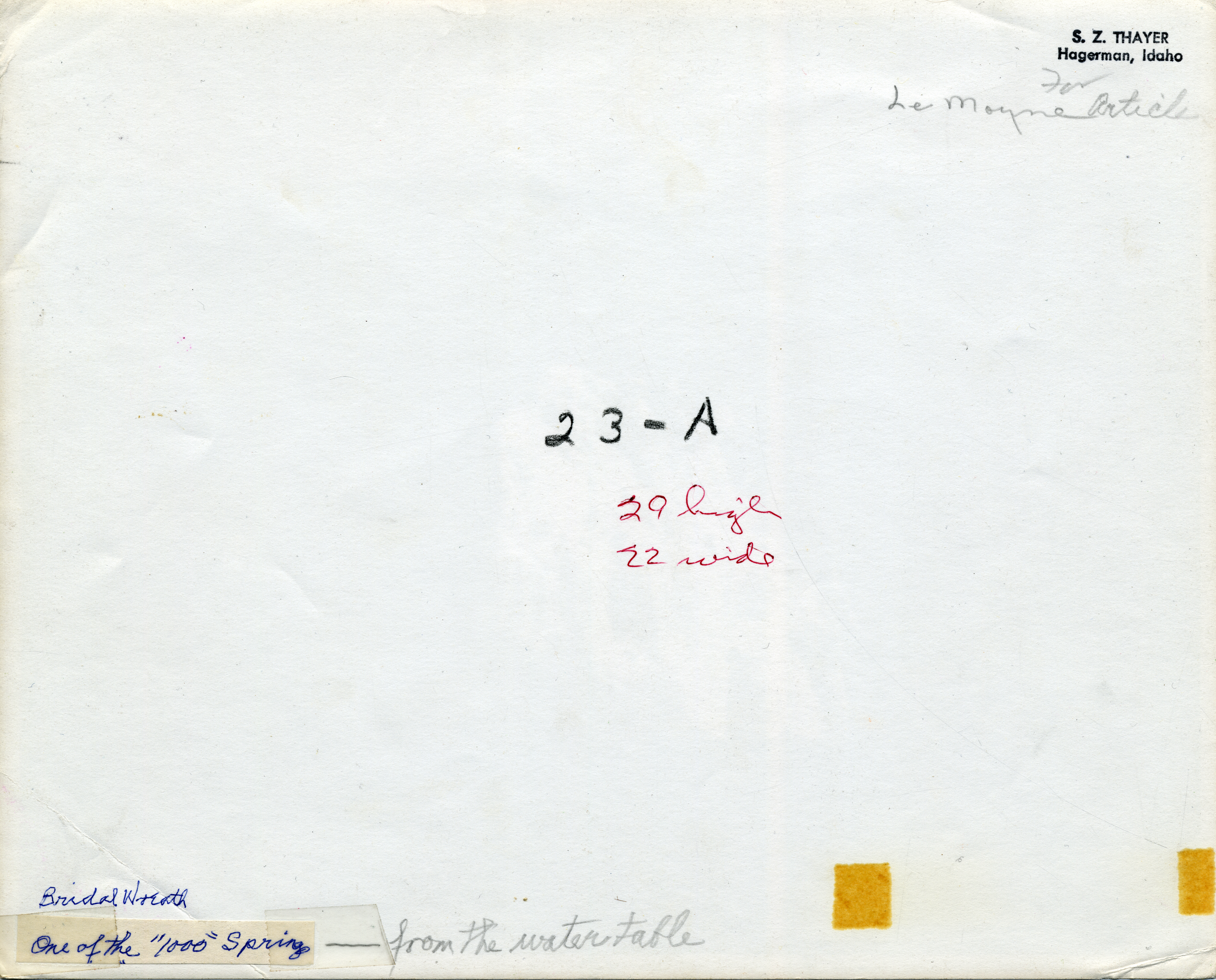 - "Bridal Wreath, one of the 1,000 Springs", Sheldon Z. and Vernice Thayer Collection, University of Idaho Library Digital Collections, https://www.lib.uidaho.edu/digital/thayer/items/mg5792_012-029.html
