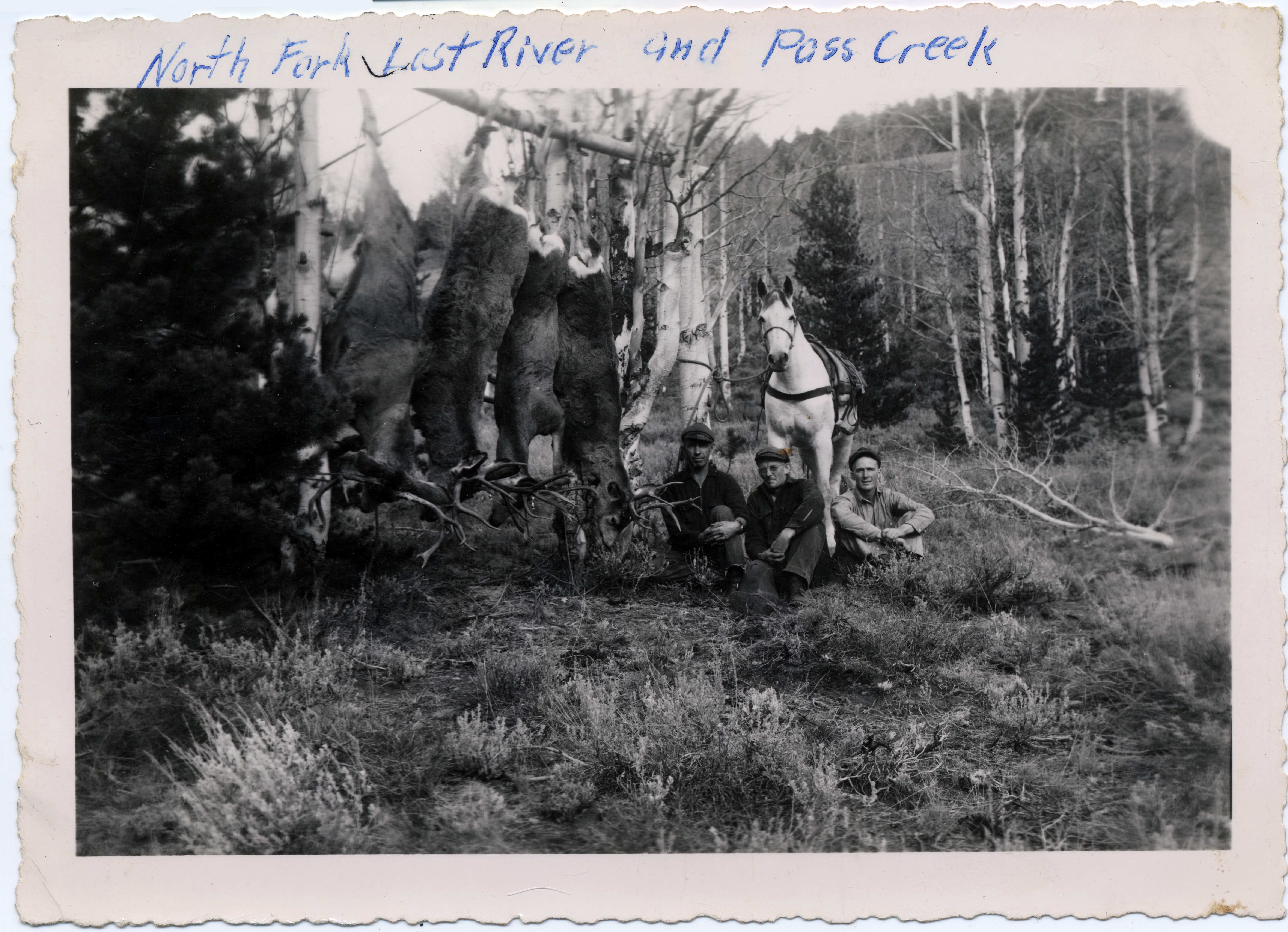 - Three men sit with a horse next to four deer carcasses, which are hanging upside down from a log. "North Fork Lost River and Pass Creek" is written on the front of the photograph. "Sheldon Z. Thayer in middle" is written on the back.
