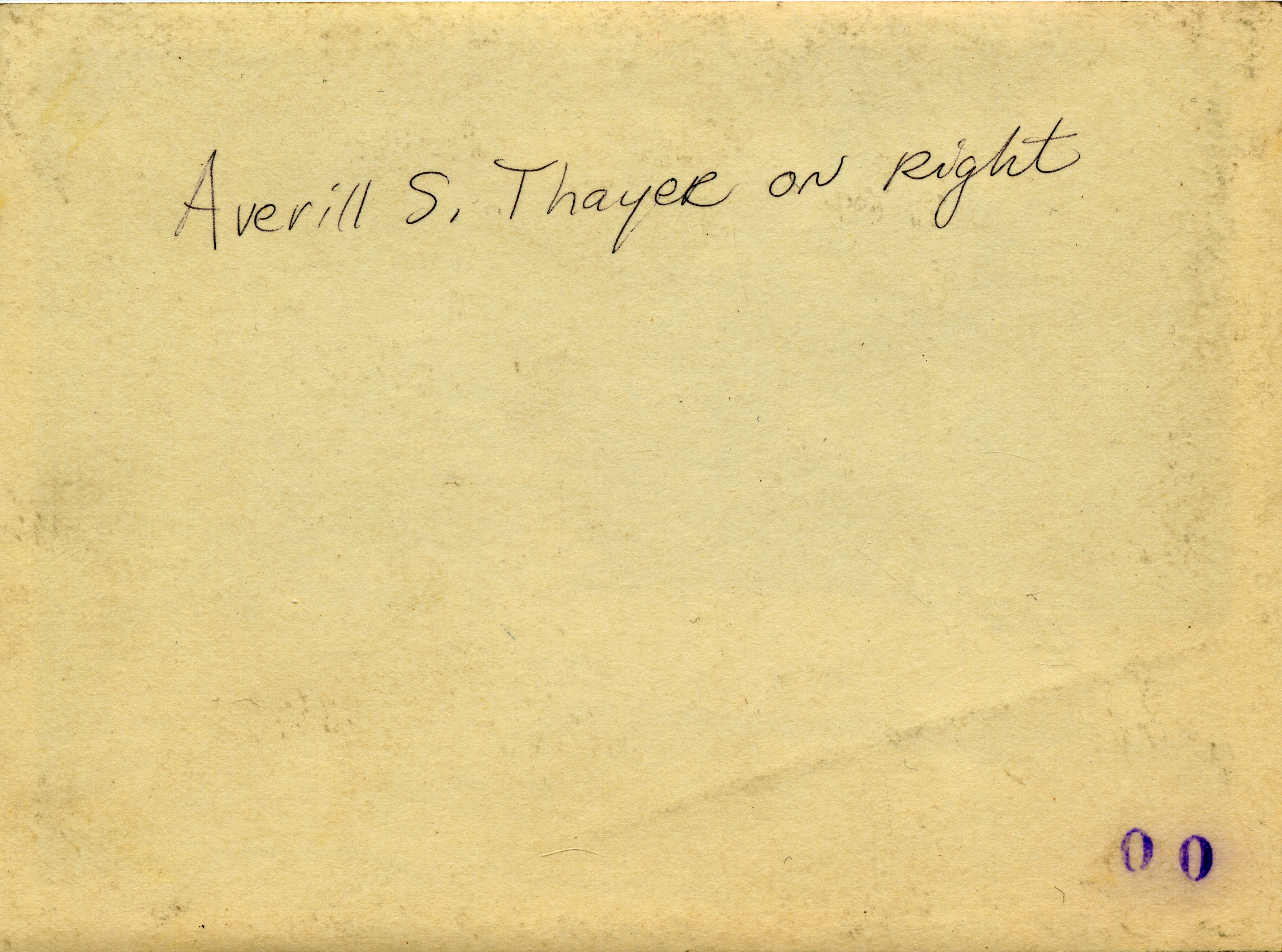- Three men and two horses stand in in a snowy clearing. "A cold camp at head of Trail Creek, Bill Madden Averill Sheldon" is written on the front of the photograph. "Averill S. Thayer on right." is written on the back of the photograph, which is also stamped with the number 00.