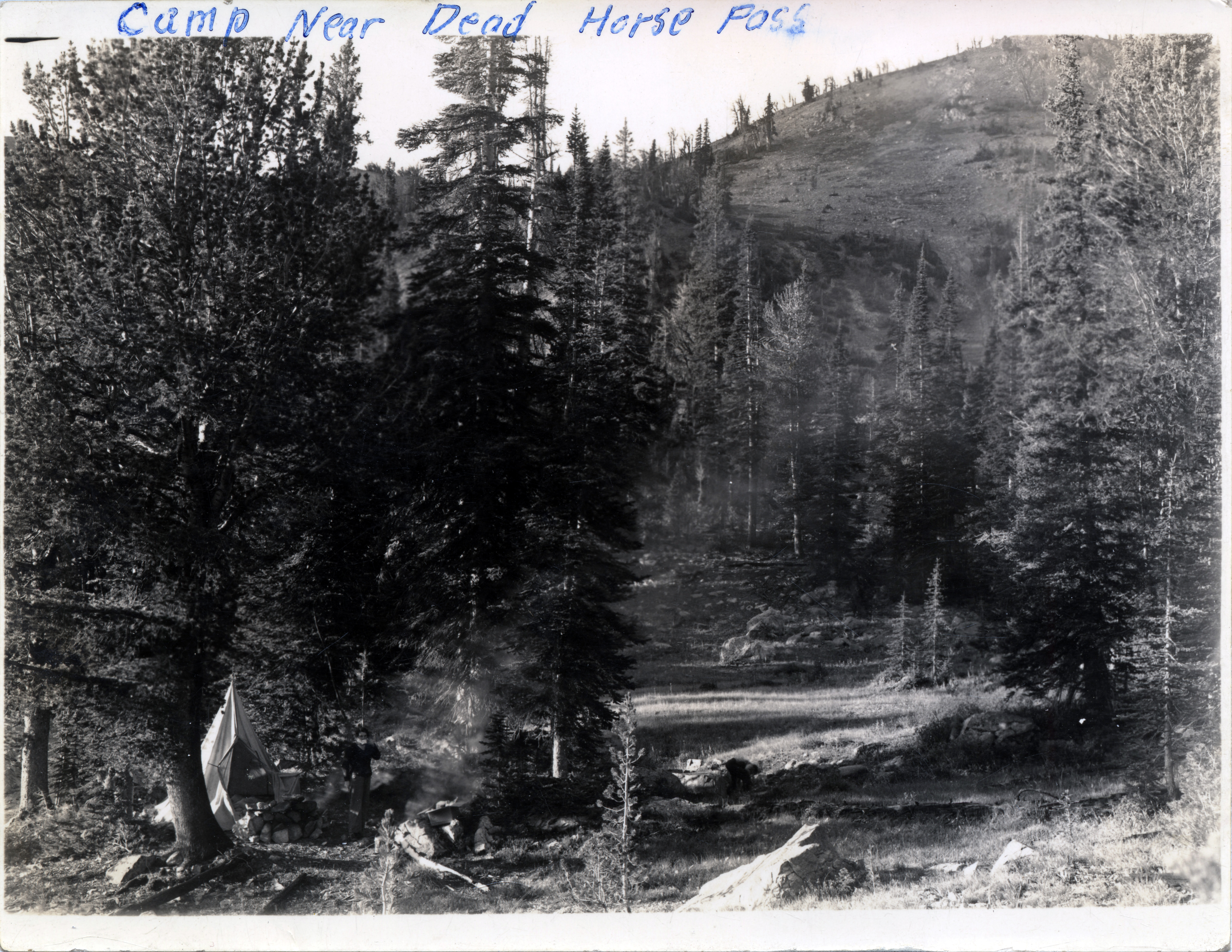 - A person stands between a tent and a campfire in a forest area. "Camp near Dead Horse Pass" is written on the front of the photograph.