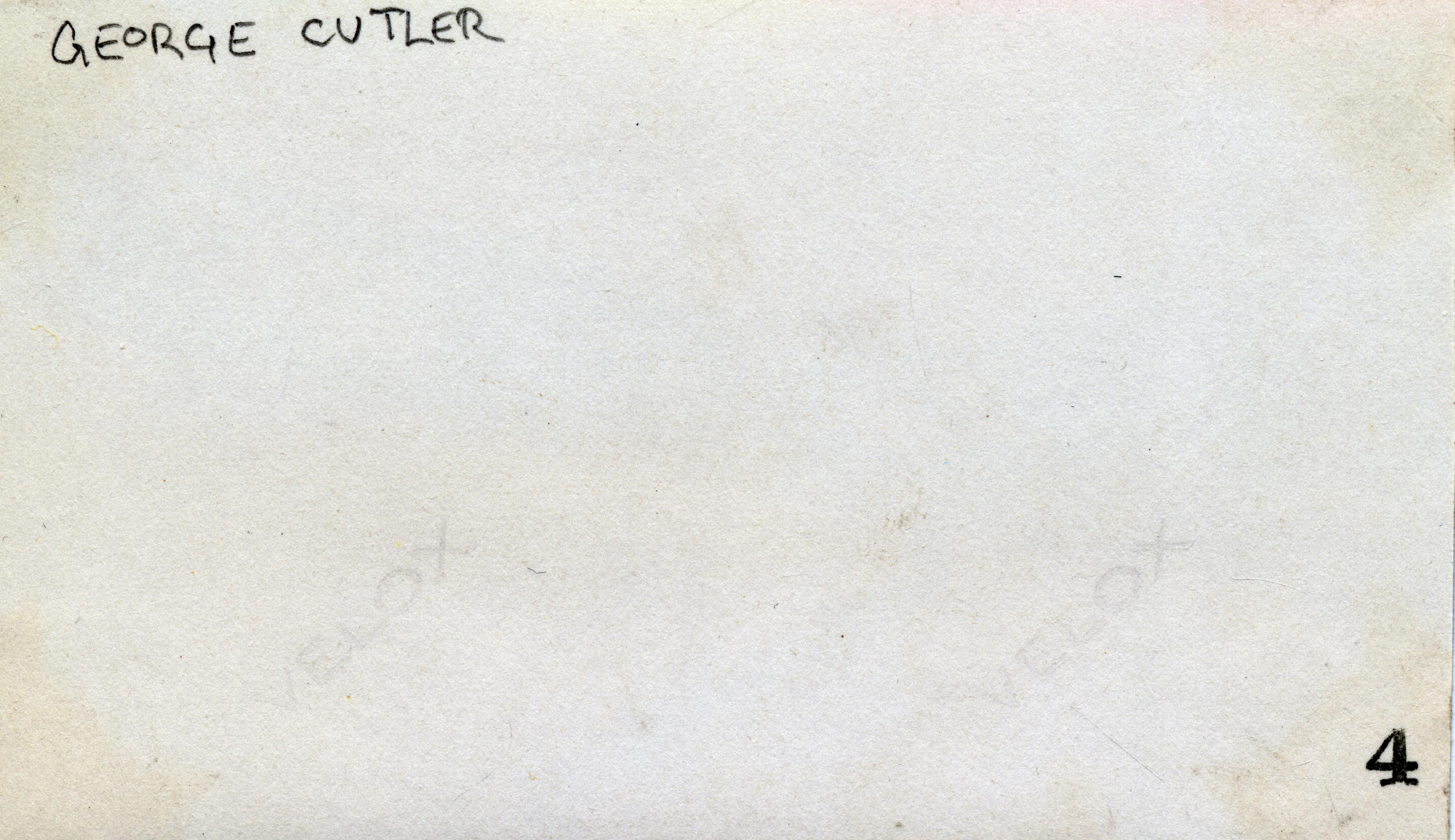 - A team of dogs pulls a man in a sled through a snowy wilderness area. Mountains are visible in the background. "George Cutler" is written on the back of the photograph, which is stamped with the number 4.