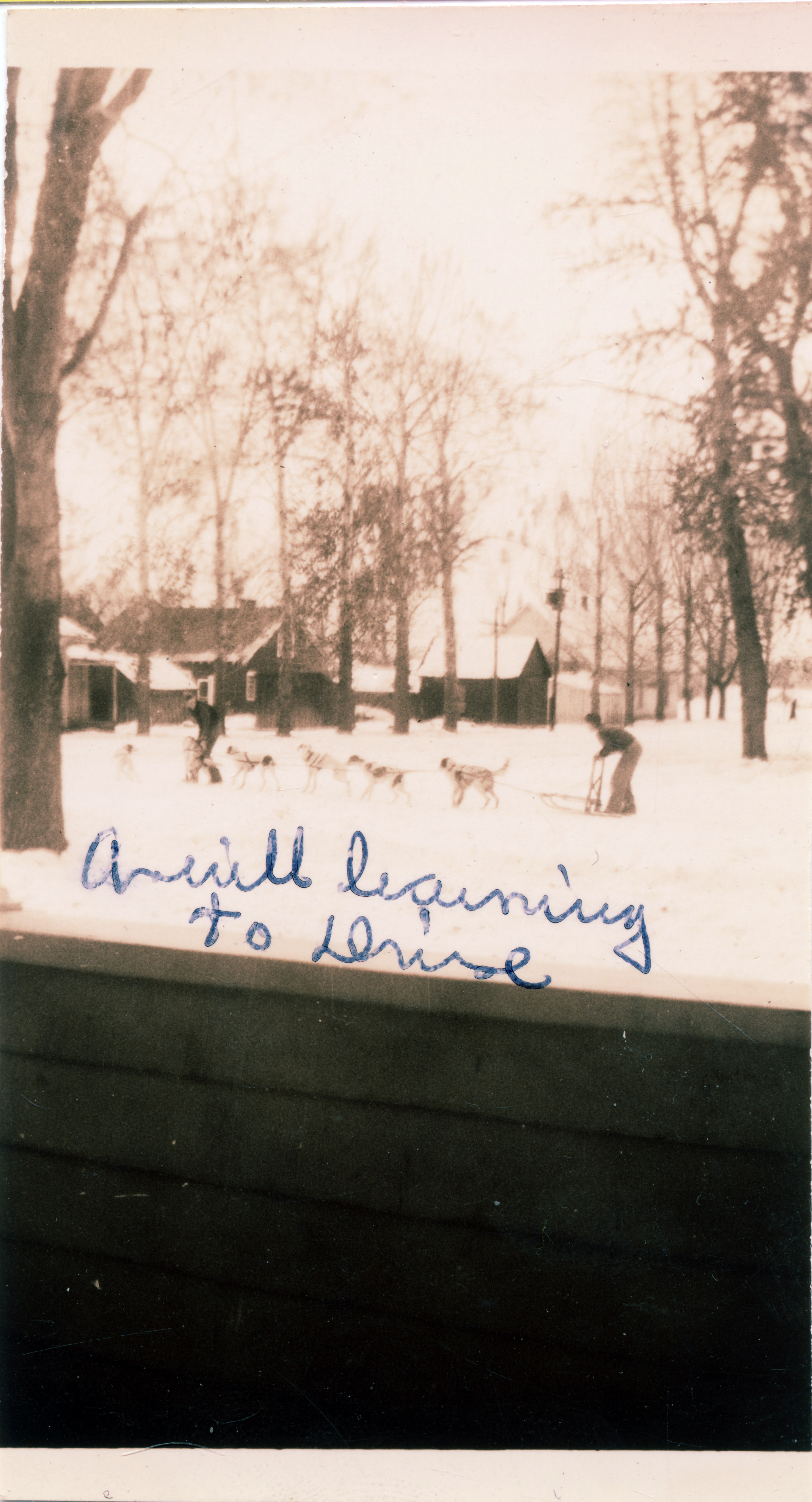 - One person stands in a sled attached to a team of dogs, while a second person stands next to the dogs. "Averill learning to drive" is written on the front of the photograph.