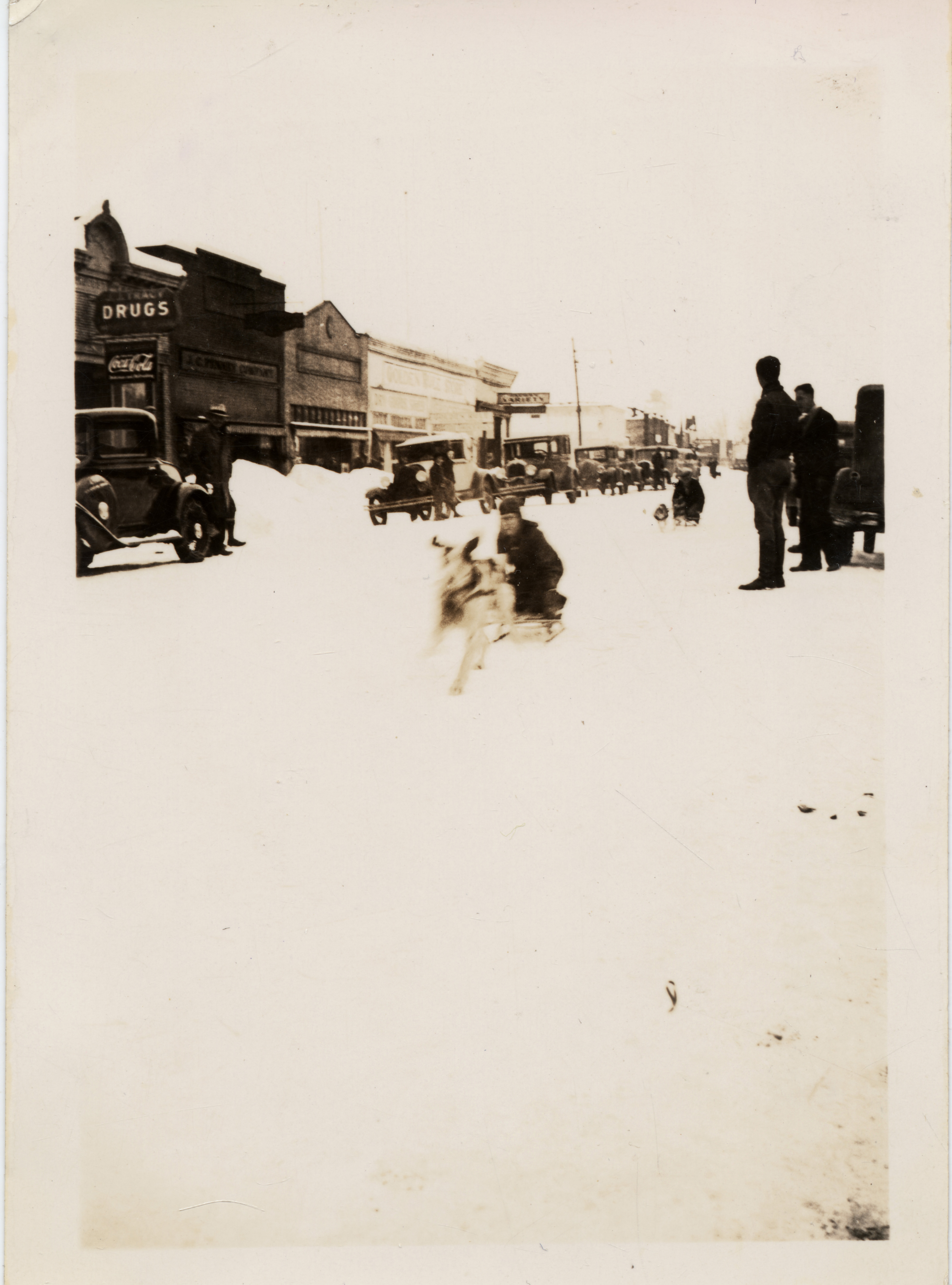 - People ride sleds pulled by single dogs down a main street. "Averill Thayer and dog Pat races on Main St. Hailey" is written on the back of the photograph, which is stamped with the number 28.