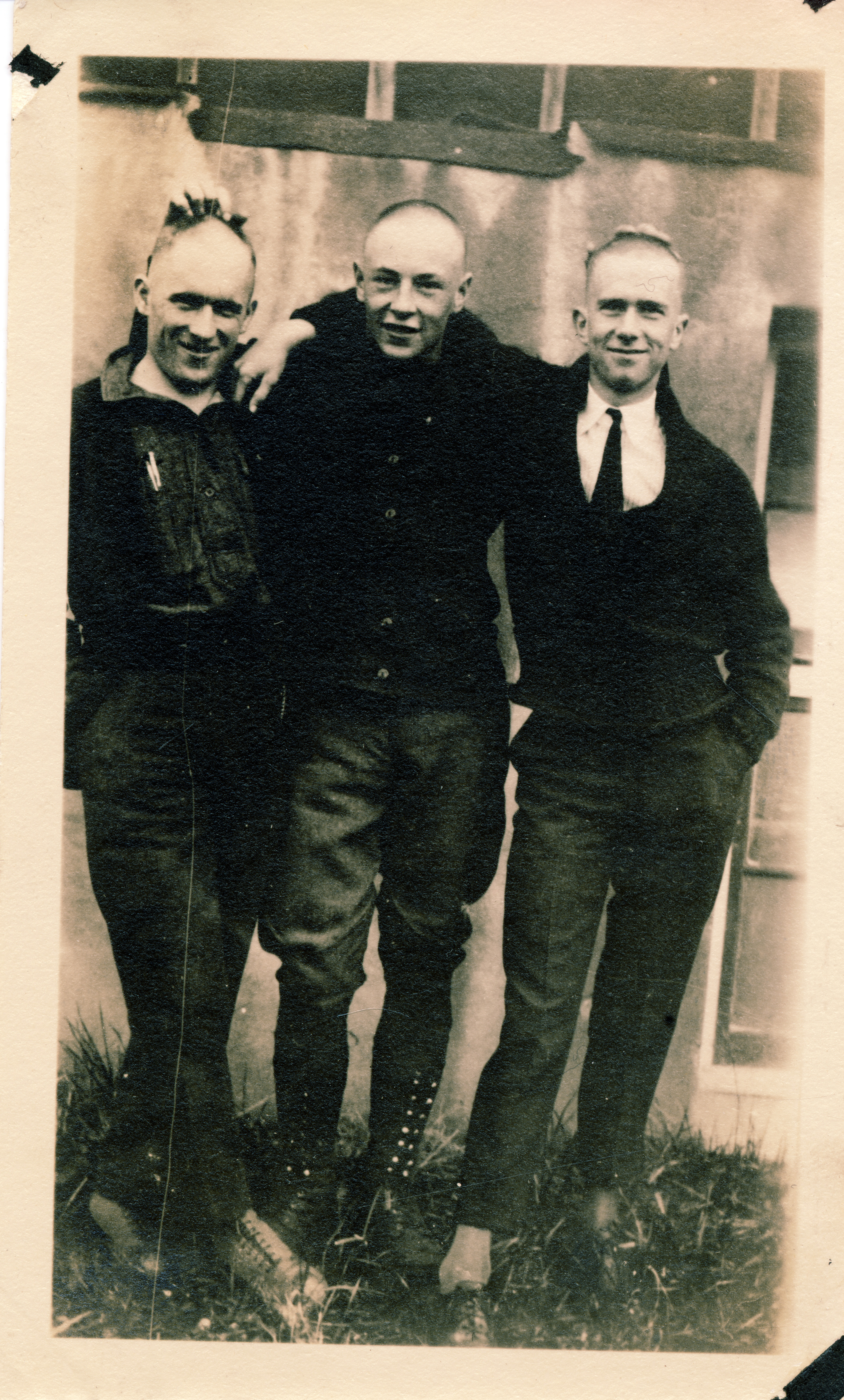 - Three men pose with their arms around each other. "College" is written on the back of the photograph, which is stamped with the number 16.