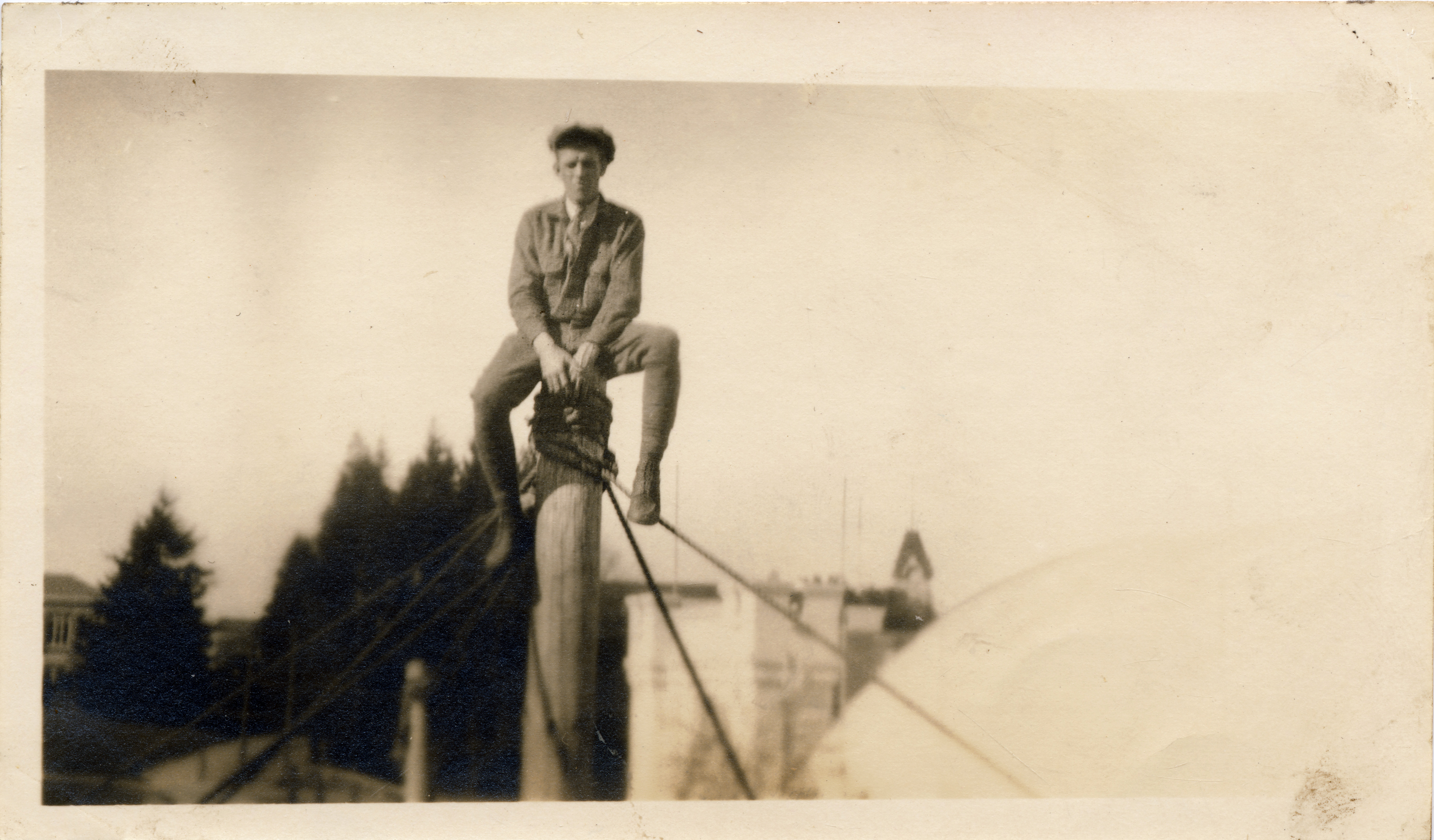 - A man sits on top of a wooden pole, above the roof of a nearby building.