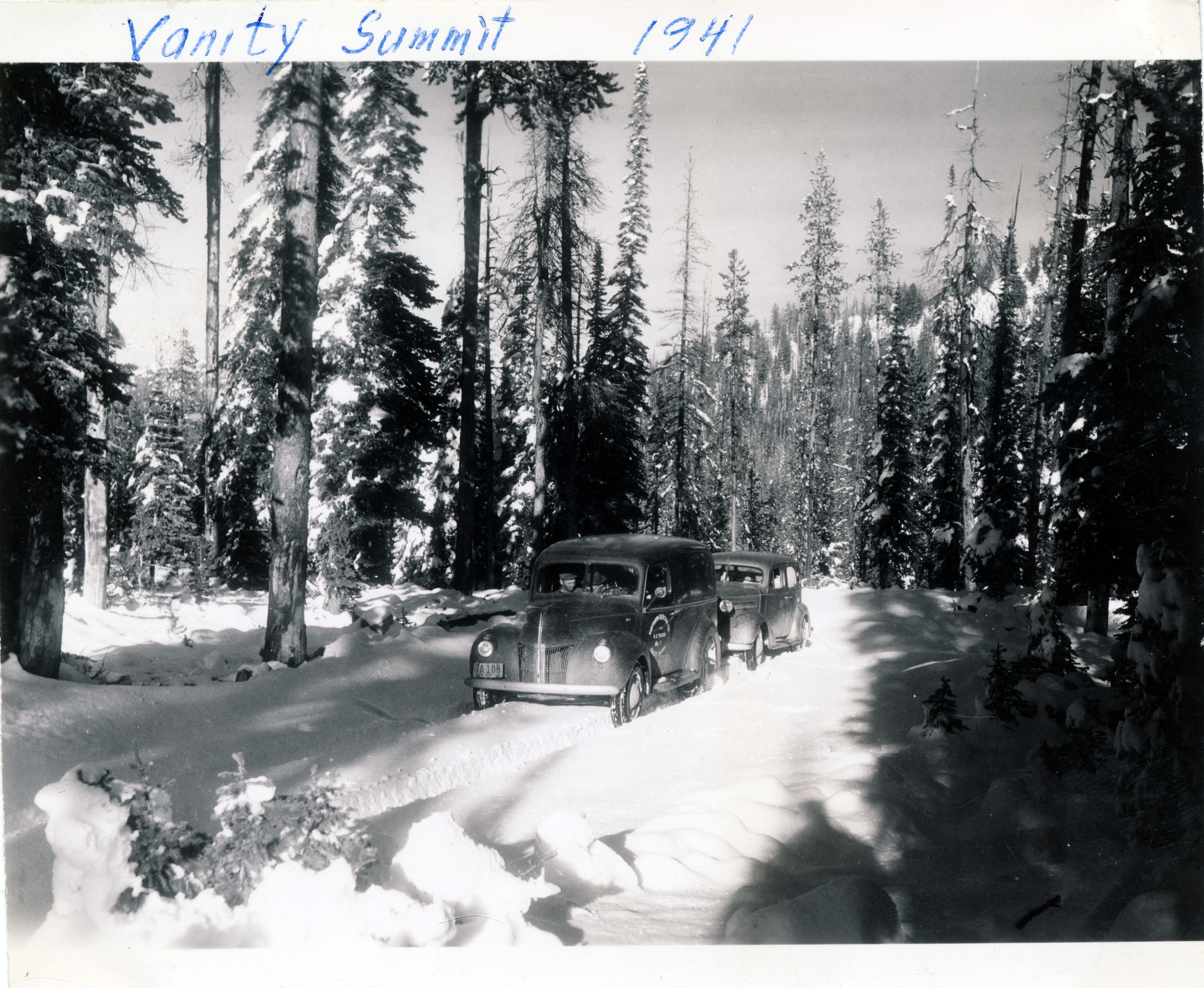 - People drive two automobiles over a snowy forest road. "Vanity Summit 1941" is written on the photograph. The back of the photograph is stamped with the number 14.