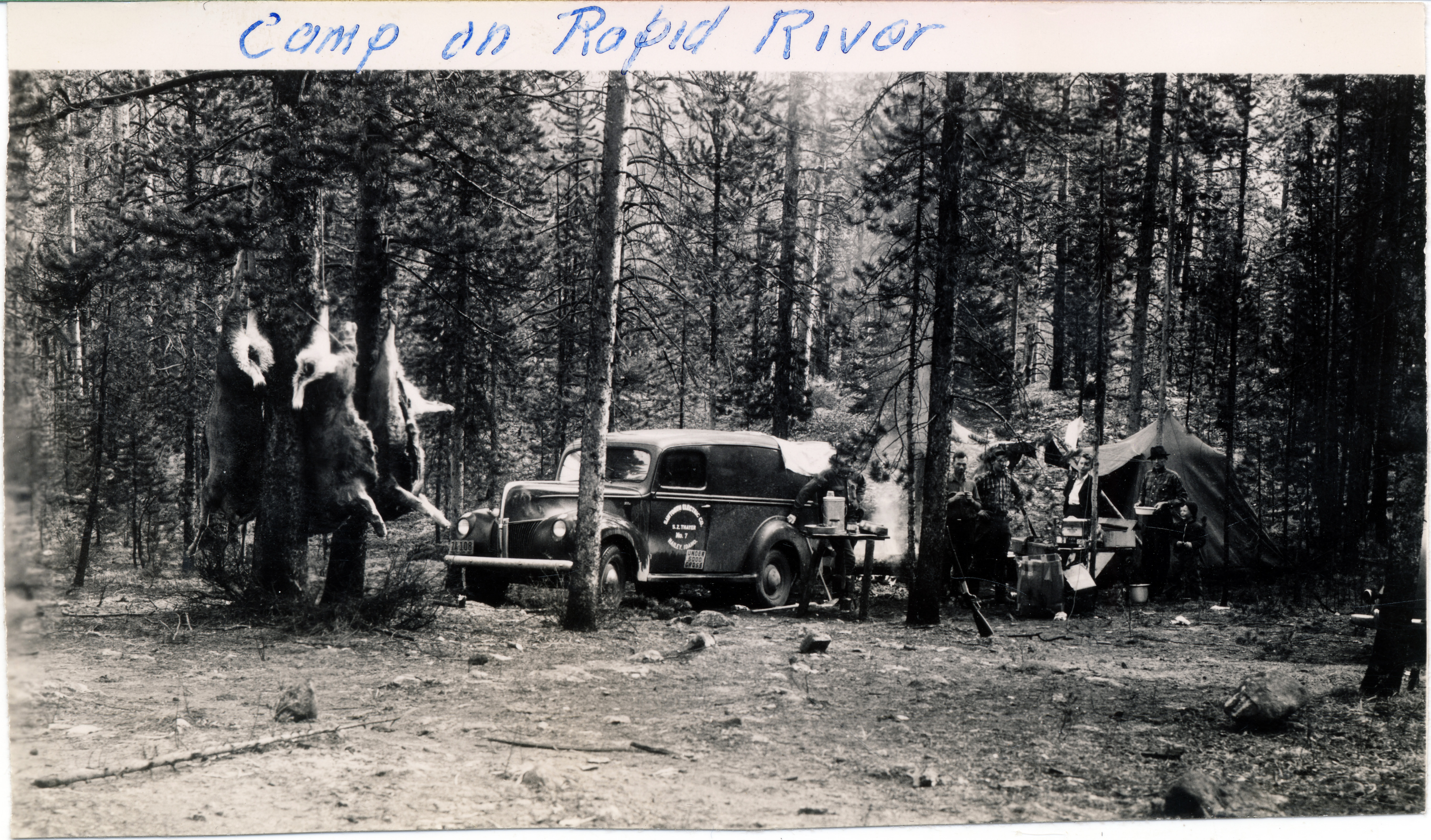 - An automobile is parked at a forest camp site. Three deer carcasses are tied upside down to a tree, and a group of people set up a tent and campfire behind the automobile. "Camp on Rapid River" is written on the front of the photograph.