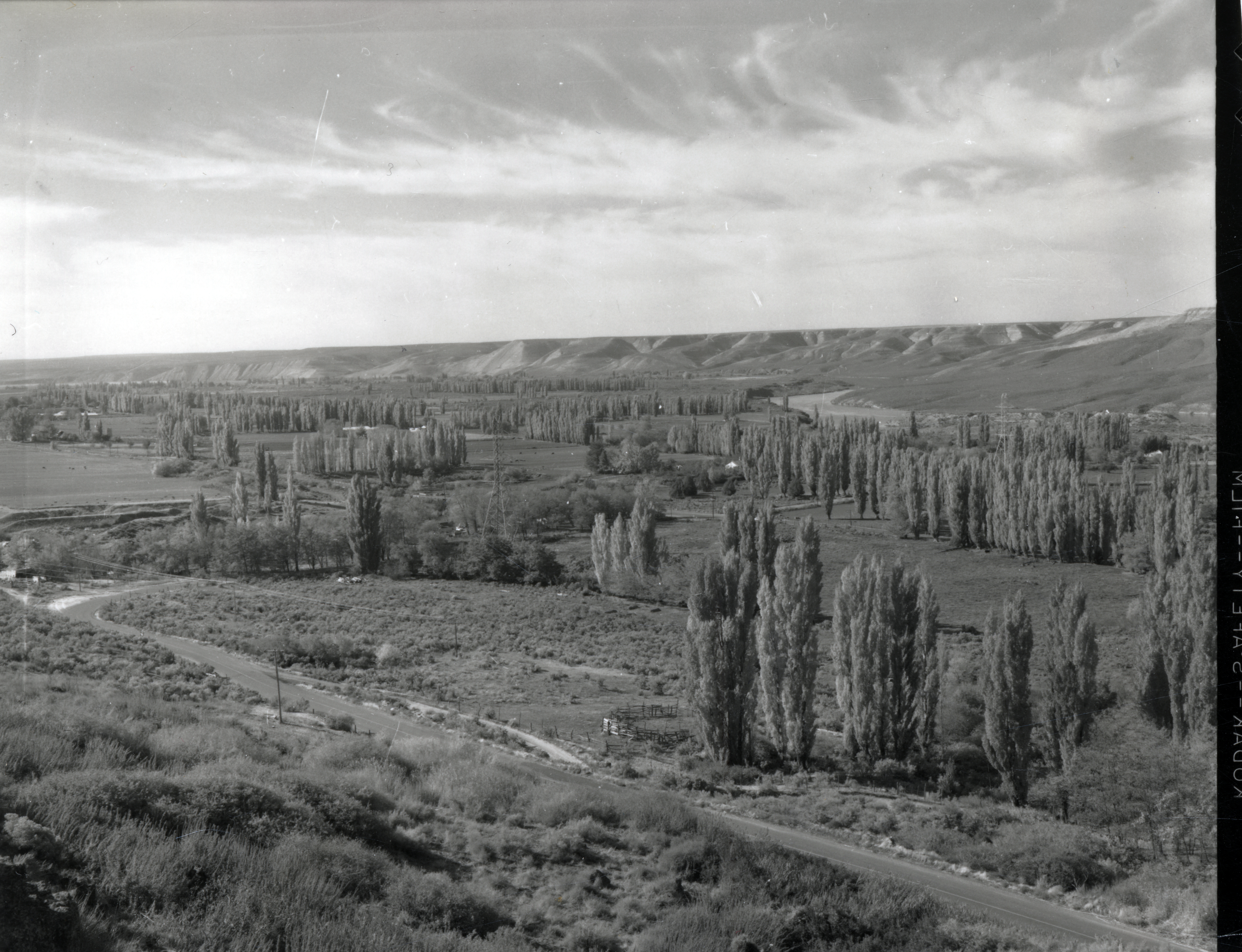 - A view from above of a road next to clusters of trees. A label on the back reads "003 Hagerman from Justice Grade 57."