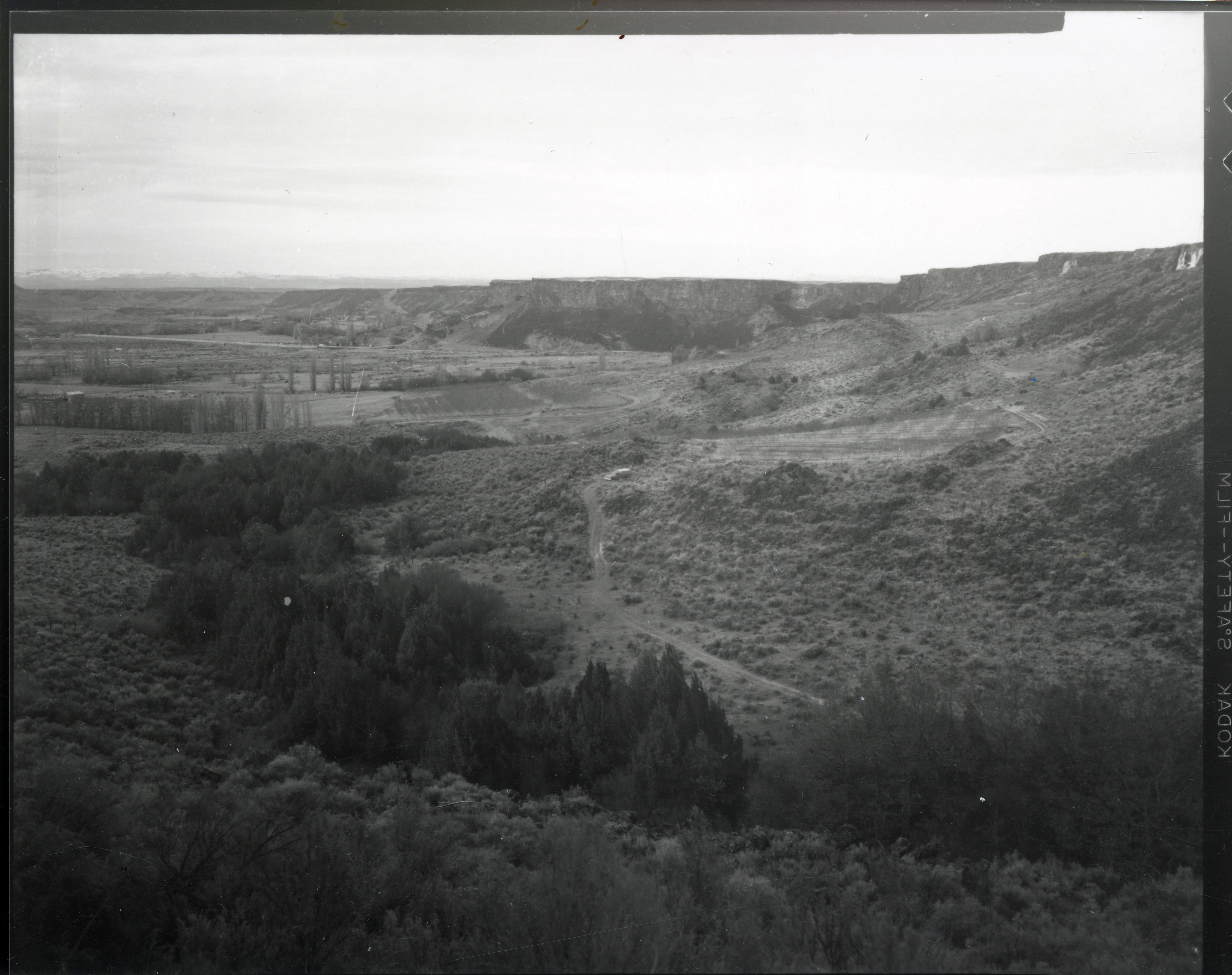 - A view from above of a sagebrush steppe area with a road running through it. A label on the back reads "1159 Fred Leach Ranch."