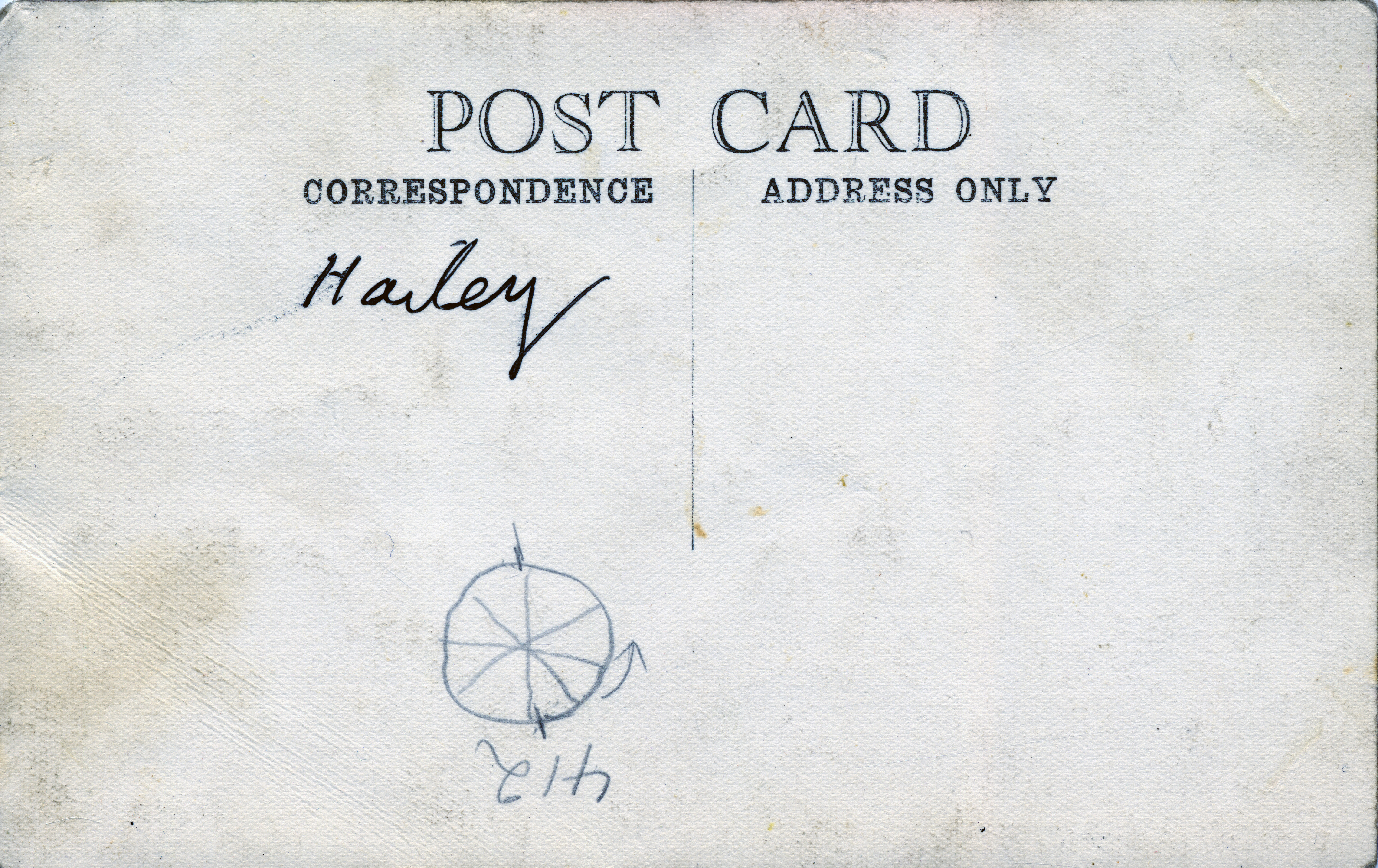 - A postcard featuring a picture of a snow-covered downtown street. "Hailey, Idaho" is printed on the picture. "Hailey" is written on the back of the postcard, and there is a pencil drawing of a wheel with an arrow and the number 412.
