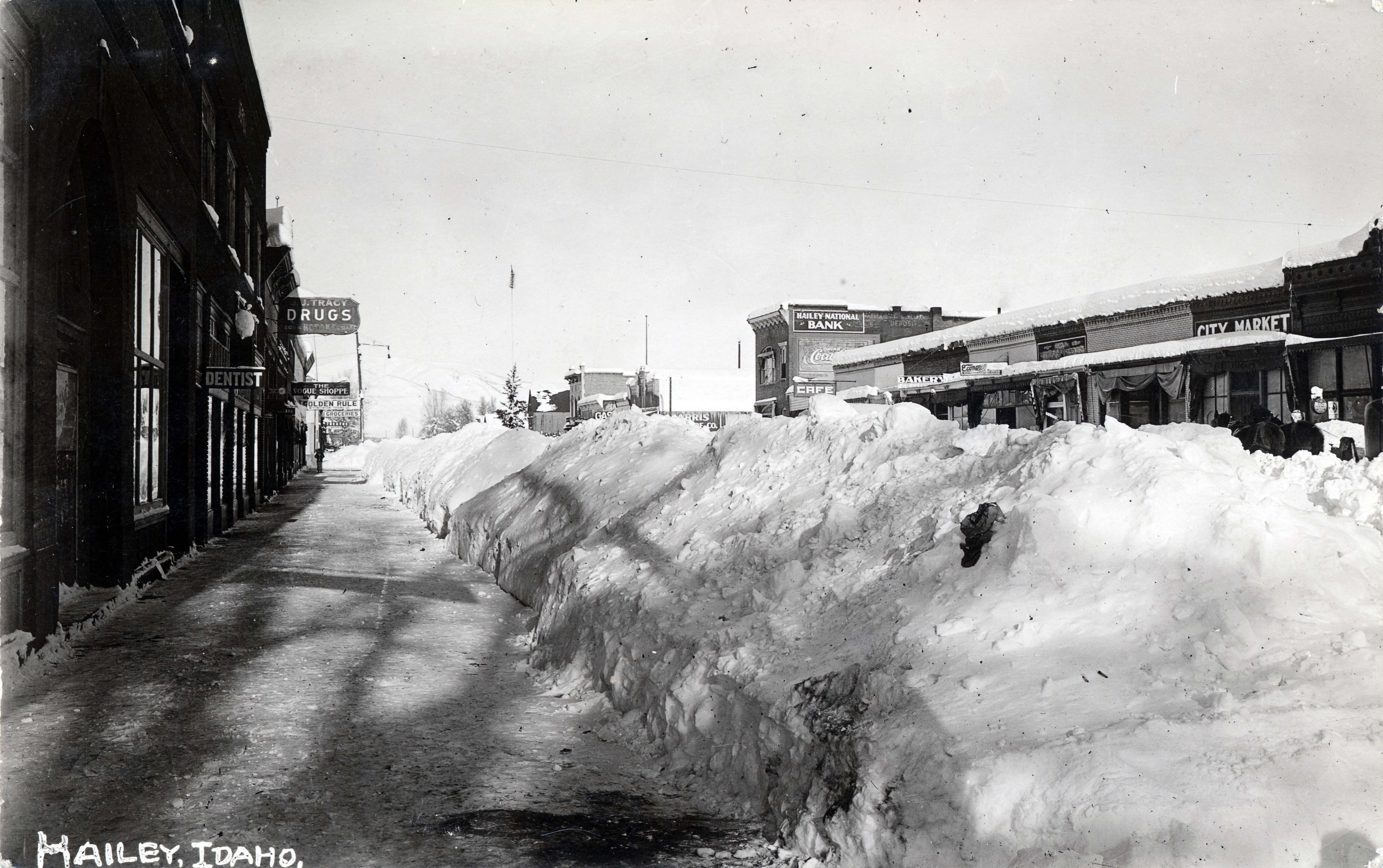 - A postcard featuring a picture of a snow-covered downtown street after the sidewalk has been plowed. "Hailey, Idaho" is printed on the picture. The back of the postcard is blank.