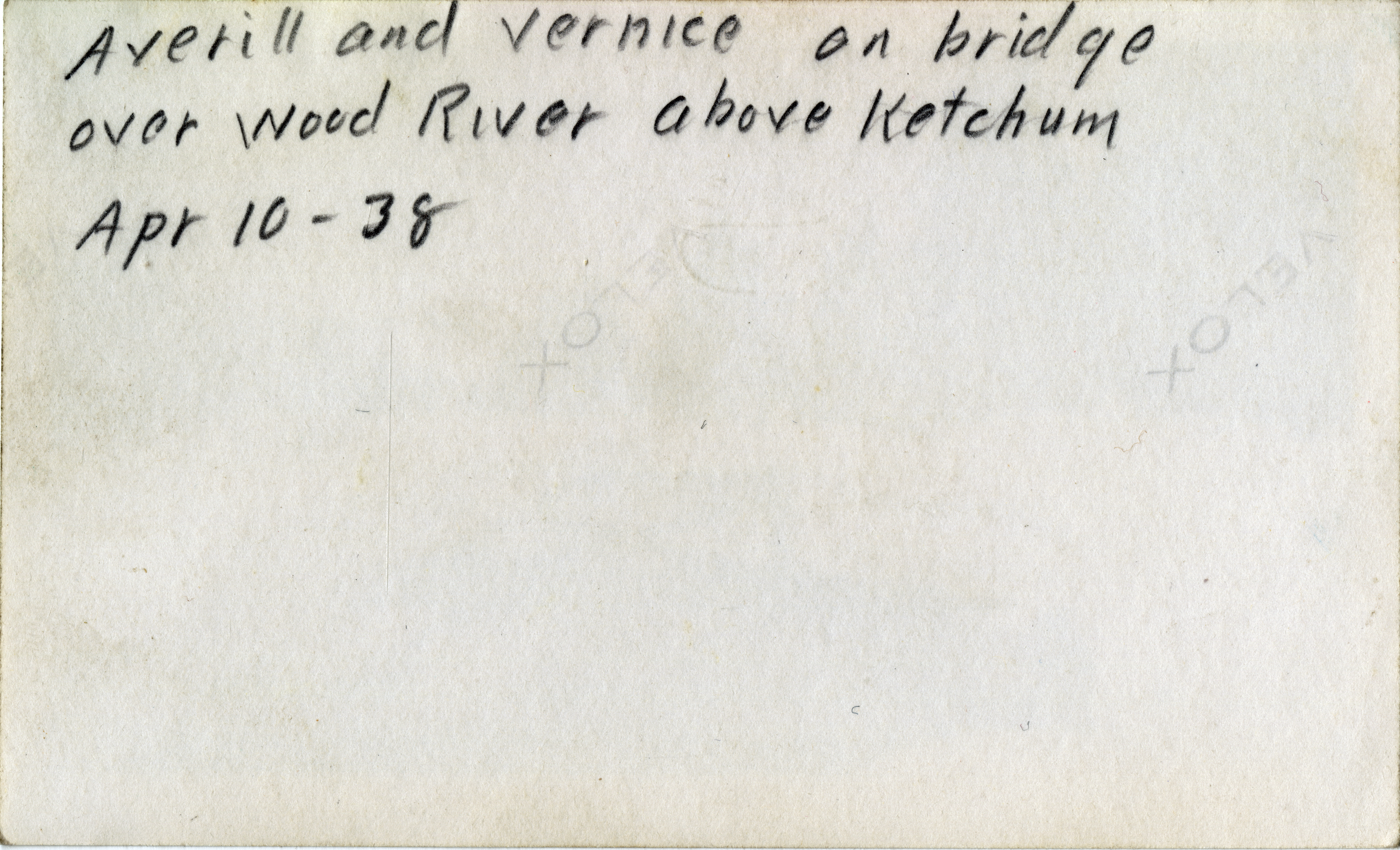 - Two people ski over a snow-covered bridge in a wilderness area. A mountain is visible in the background. "Averill and Vernice on a bridge over Wood River above Ketchum Apr 10-38" is written on the back of the photograph.