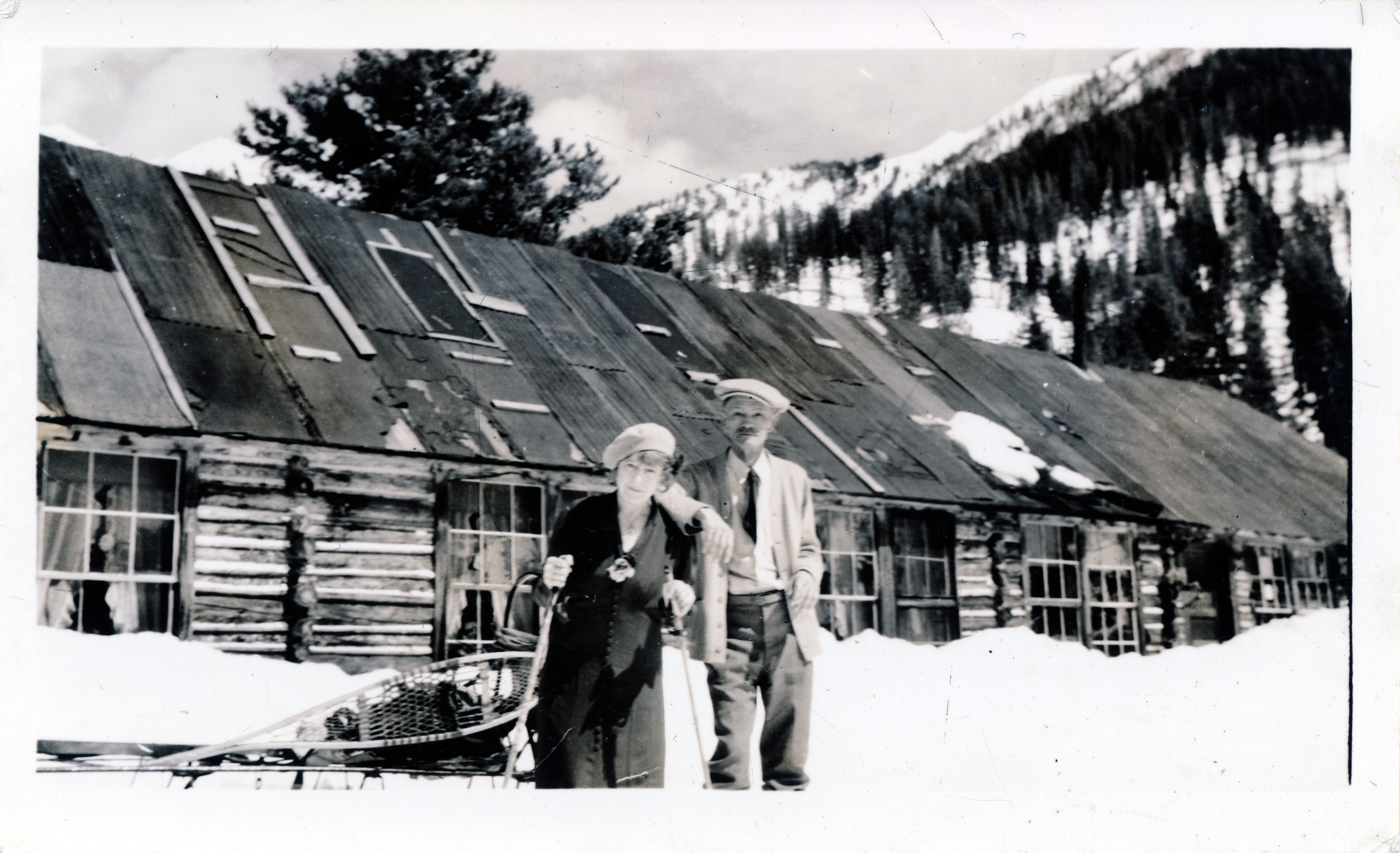 - A man and a woman stand next to each other in front of a single-story wooden building. Behind them is a sled with snowshoes strapped to it. "The Rutherfords Mascot Mine Idaho April 17 1938" is written on the back of the photograph.