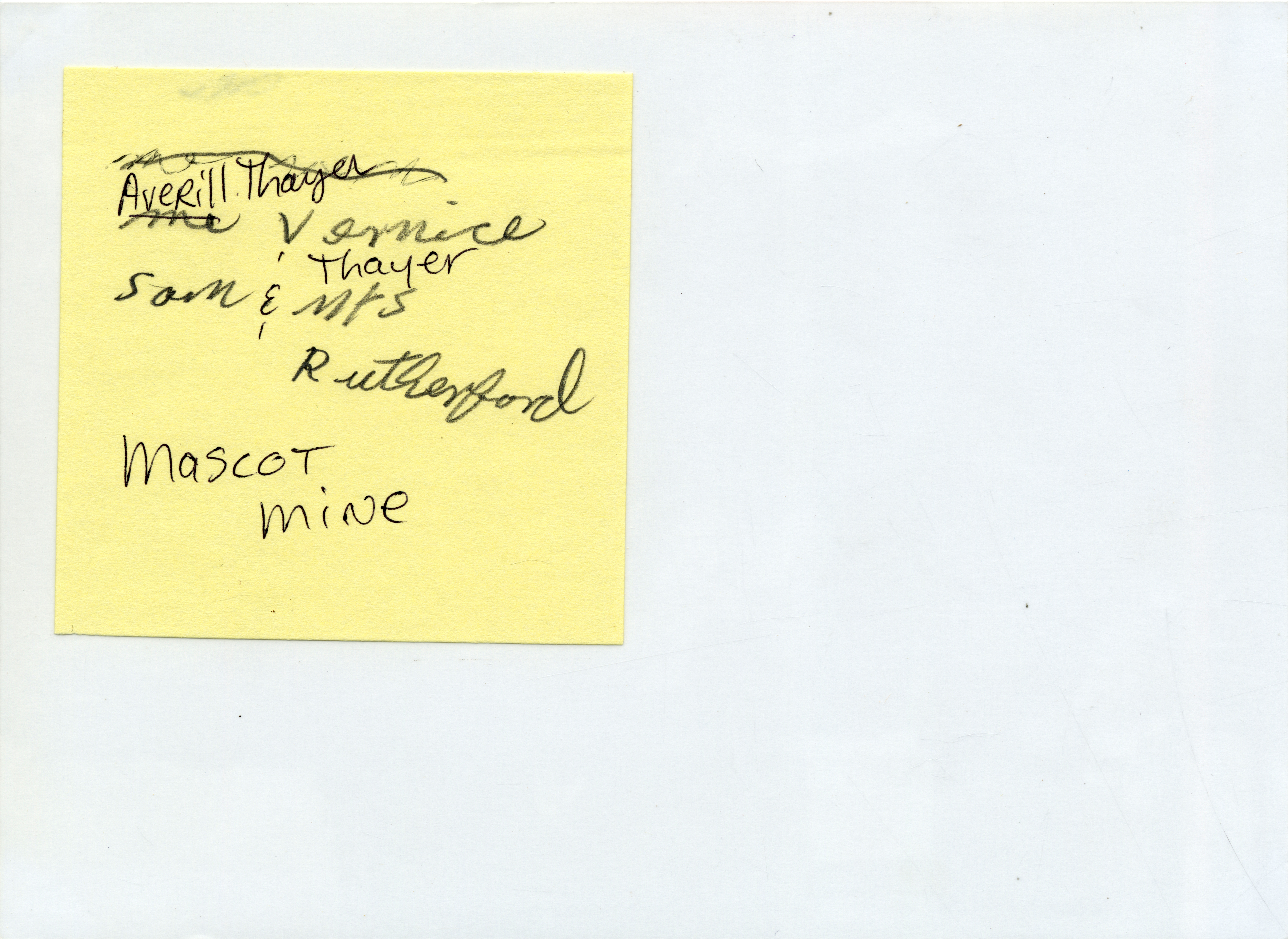 - "Rutherfords at Mascot Mine", Sheldon Z. and Vernice Thayer Collection, University of Idaho Library Digital Collections, https://www.lib.uidaho.edu/digital/thayer/items/mg5792_024-011.html
