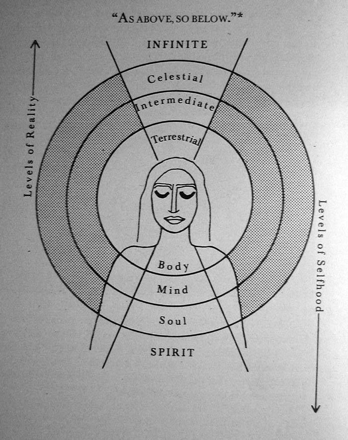 Infinite - the pervasive Brahman Celestial - Trimurti, Gods and Goddesses Intermediate - ghosts, departed souls in limbo, the psychokinetic world Terrestrial - natural, physical, finite, temporal world maya - illusion Body - biological, physical, finite, temporal senses Mind - ideas, personality and gunas Soul - unique jivas Spirit - the pervasive Atman |