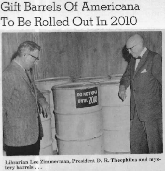 In 1962, W. C. Cheney, an inventor from Seattle, WA presented President Theophilus with seventeen 55-gallon drum barrels on the condition that the barrels be opened in 2010. The year 2010 has arrived and the mystery barrels have been opened.