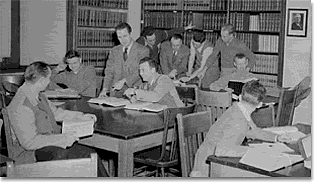 By this time, the library's full-time staff had grown to 11 professional librarians and seven clerical workers, and Zimmerman was pushing for three more of each. Forty students worked part-time. "Working so closely on the move brought about a heightened cohesiveness among the staff," Beck recalled. "This spirit of devotion and enthusiasm continued" for years. The new building inspired a wholesale reorganization of the library. In his 1956-57 biennial report to the president, Zimmerman noted: "In our old quarters functions were separated on the basis of form reference collection, periodical collection, general collection, etc. In the new Library, they are integrated on the divisional concept... The arrangement of furniture, too, providing study islands within the stacks, has served to eliminate barriers between books and readers..." [This arrangement, however, would not survive. With its 1991 expansion, the library reverted mainly to the pre-1957 system.] The 1950s and '60s saw the library continue to build specialized and rare book collections, often through extraordinary donations. In 1950, Mrs. Lucy Day, widow of Jerome J. Day (who had previously donated his Pacific Northwest Americana collection in 1941), donated her late husband's collection of rare books some 1,365 volumes, many bound in leather and hand-tooled in gold by Italian craftsmen. Earl Larrison, a zoology professor, gave his collection of first editions of the works of Sir Walter Scott. And noted screenwriter Talbot Jennings, a UI graduate, donated several thousand books.
