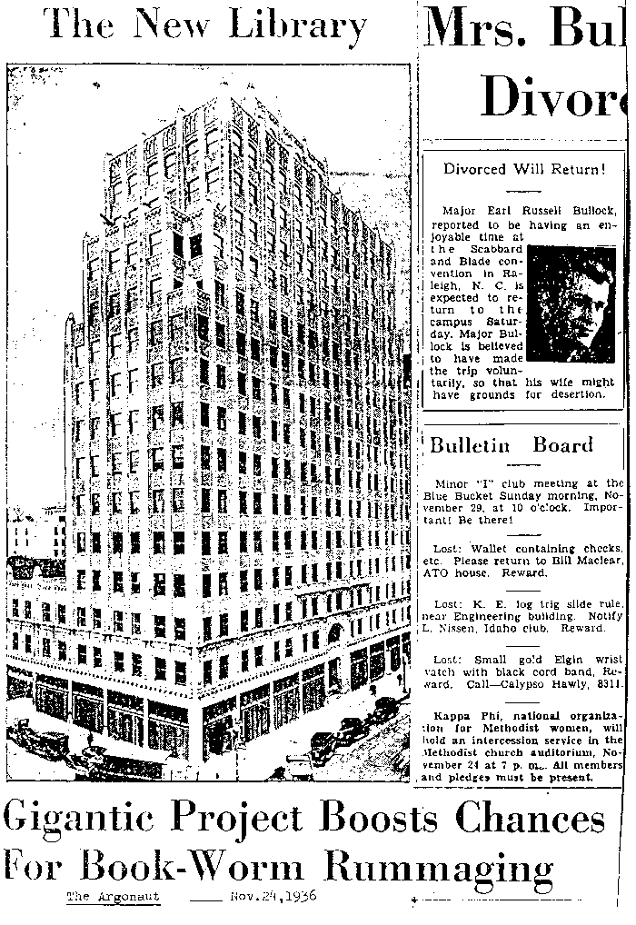 Prank article from the Argonaut, 24 November 1936, uses photo of multi-storey office tower in downtown Spokane as image of "The New Library."