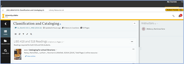 - Please note, the reading list will not display for instructors when they use the “Student View” feature of Canvas.