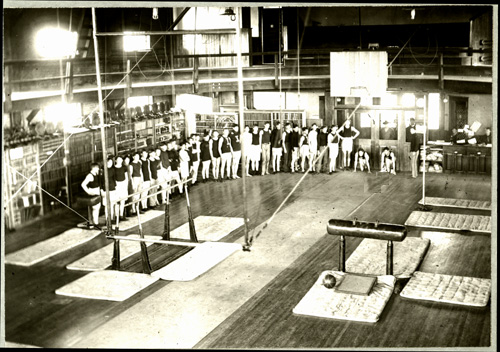 On Monday morning after the fire the library opened in the gymnasium. Linoleum was rolled down, tables set up, a few chairs placed around, and then at night, at 4 o'clock it was turned over to the students for use as a gymnasium. They had constructed wooden bookcases on one side under the balcony and if by chance a basketball went behind the bookcase the boys went up the bookcase on the shelves, step by step and down went the books. So there would be a heap of books on the floor after the games and they had to be sorted and put back as soon as possible.