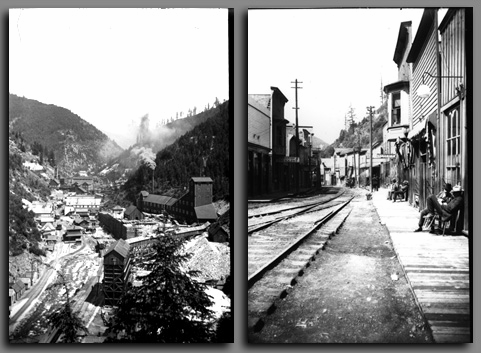 Two views: Burke, looking north at Tiger Peak, 1903; Downtown Burke, looking south, c.1907. Special Collections and Archives, University of Idaho Library. #96-25 and #96-29.