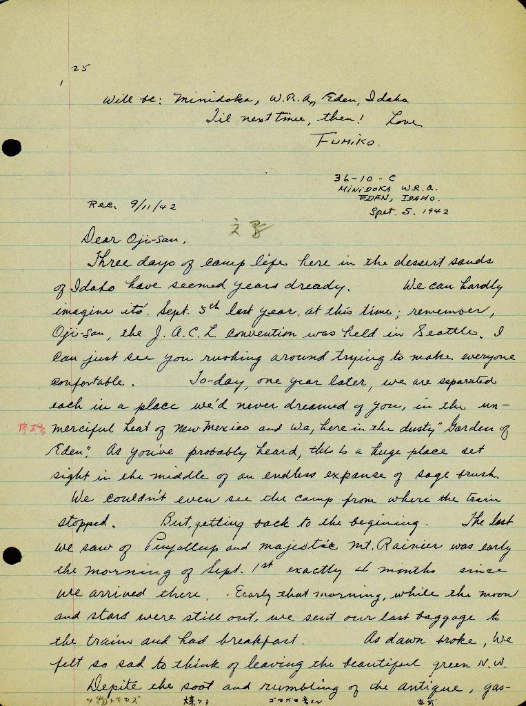 Letter: Niece Fumiko to George Shihei Shitamae, September 5, 1942. George Shihei Shitamae papers, Special Collections and Archives, University of Idaho Library.
