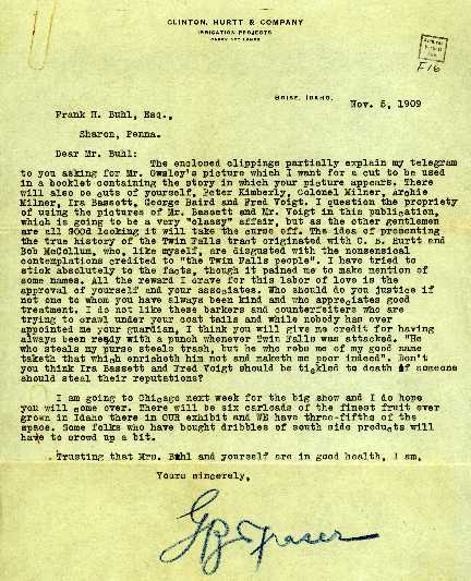 George Fraser was a publicist for Boise's Clinton, Hurtt & Company which managed the real estate sales for the irrigated tract. He was also editor of the Twin Falls News, which magnified his community booster role. In this letter, Fraser refers to the efforts of others to capitalize on the success of the Twin Falls project and seeks Buhl's help in publicizing his own efforts.