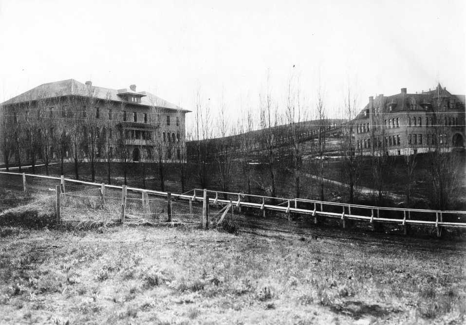 Caption: Ridenbaugh Hall (on left). 1902. Historical Photograph Collection, University of Idaho Library. #1-58-17.