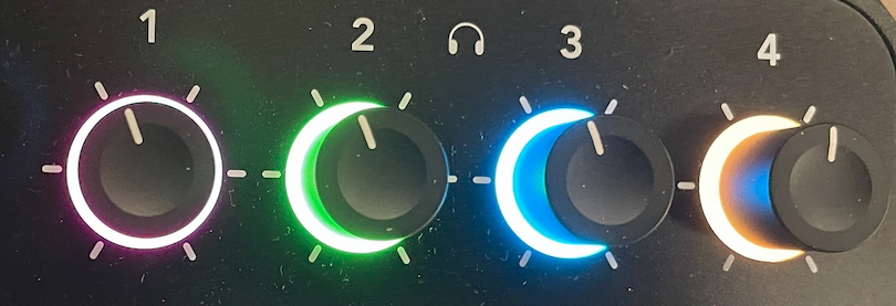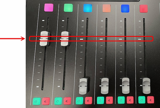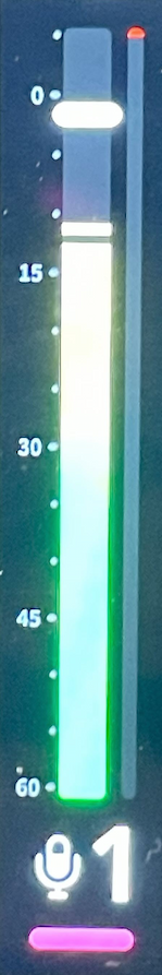 Adjust your fader up or down if needed to stay within this range. (Make note of the labels of mics and headphones that are color-coded: pink and green on channel 1 and 2)